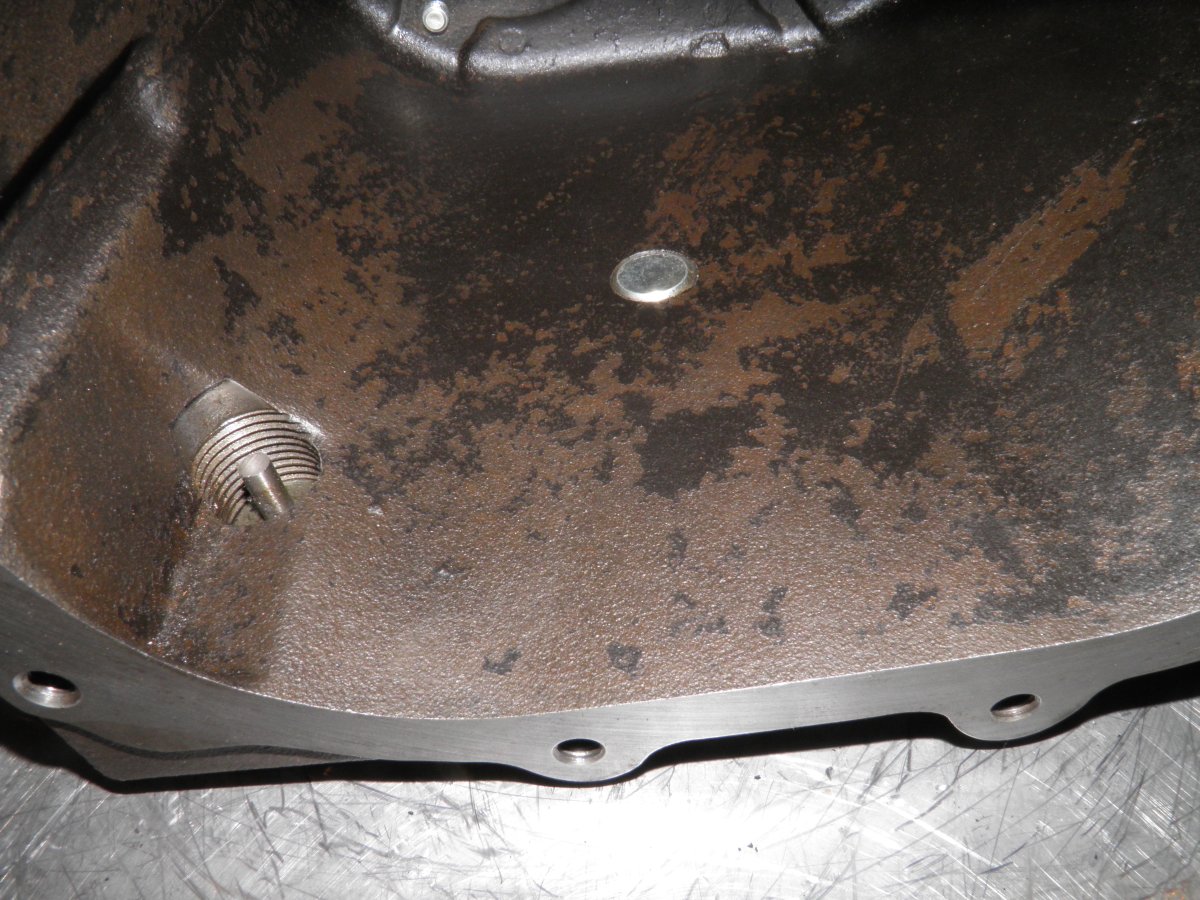 On dépose le carter en tirant vers le haut. Il faut peut être le décoller un peu à cause de la pâte joint. Prendre garde au tube de piquage d'huile. On découvre, au fond du carter, le roulement à rouleau de l'arbre de sortie, et le roulement à rouleau de l'arbre secondaire. Notez l'entrainement de la pompe à huile avec ses 2 méplats.
