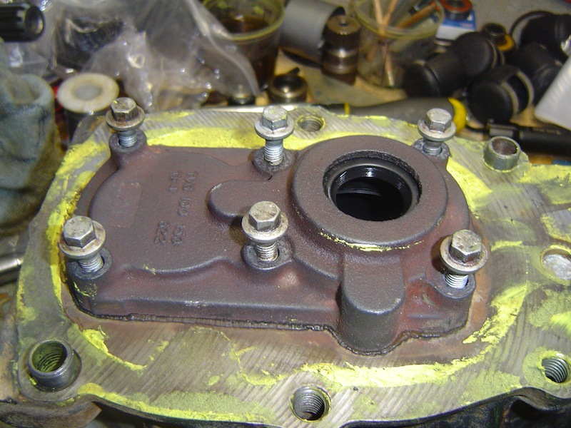 Sur le carter de prolonge, celui en alu, on démonte le tube d'aspiration de la pompe. On sort le joint spi de l'arbre de sortie qui nous permet de chasser le roulement à rouleaux avec la bague de distribution de l'huile.