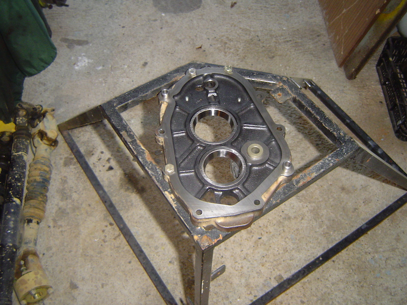 Derrière cette plaque, on trouve la bague extérieure du roulement de l'arbre d'entré et son joint spi, ainsi que la bague extérieure du roulement avant de l'arbre secondaire. Cette dernière possède une rainure extérieure avec un clip.