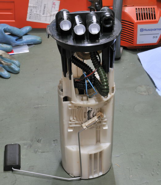 Je suis tombé en panne de jauge l'an dernier. C'était la brasure d'un des 2 fil sur la platine qui avait sauté. On voit ici les 2 fils bleu de la jauge. Elle est "clipsée" sur la pompe.