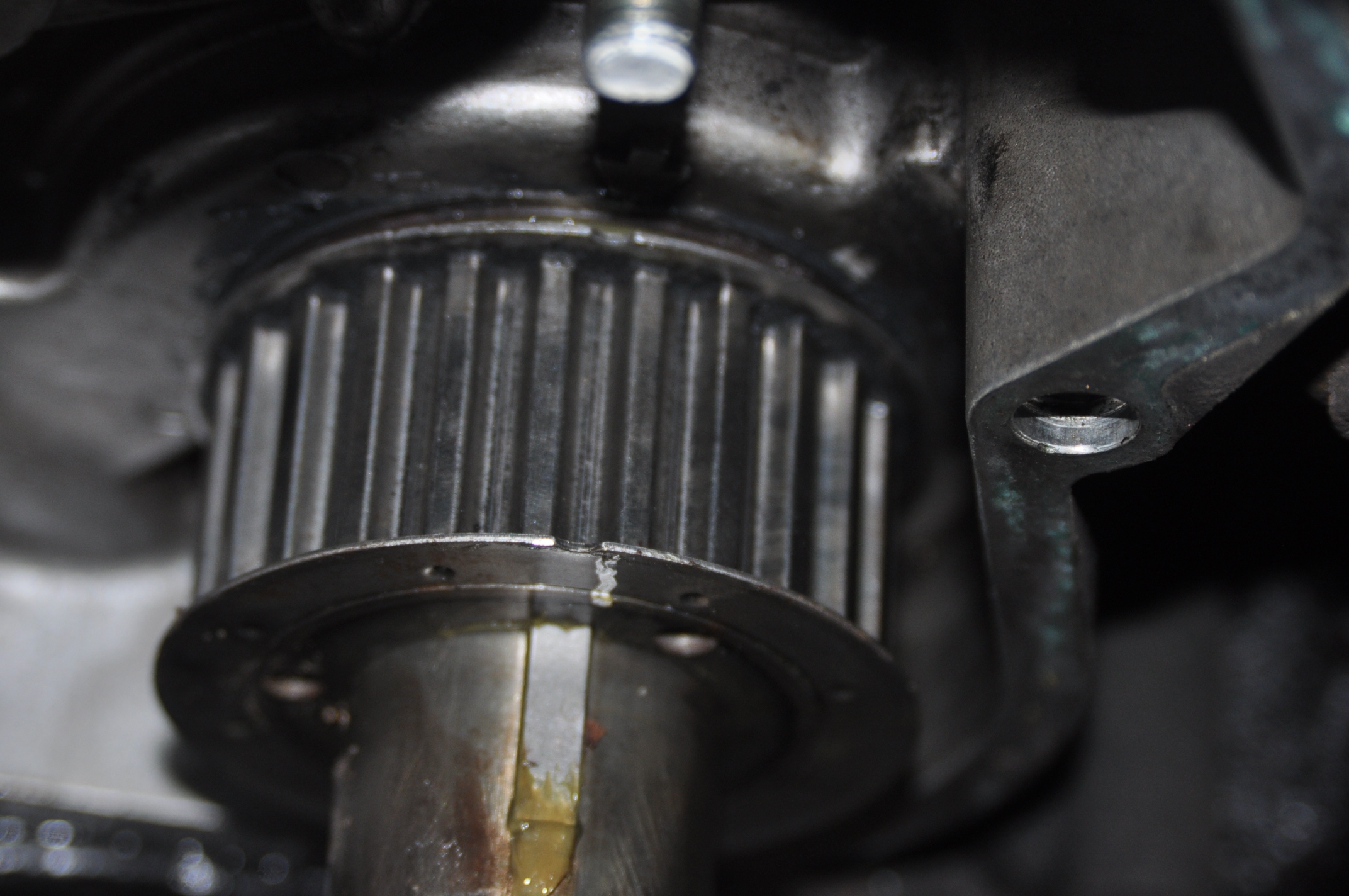 2) La courroie semble avoir frotté sur quelque chose. D'autre part, on remarque qu'une des vis du couvercle est blanche, ce qui indique une corrosion du trou du carter. Lors du serrage de cette vis, est-il possible qu'il y ait eu un effet de bourrage de l'alumine qui aurait entraîné l'éclatement d'une partie du bossage (fragilisé par la corrosion), qui serait alors venu en contact avec la courroie?