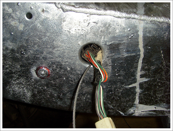 Quand on sent que le câble butte contre un obstacle on cherche a en déduire sa forme en fonction des points de soudure et si on y est obligé on perce en face supérieure du longeron un trou de Ø 6 mm pour regarder et éventuellement guider le câble et sur le coté un trou de Ø 9 mm pour enfiler l'ampoule.