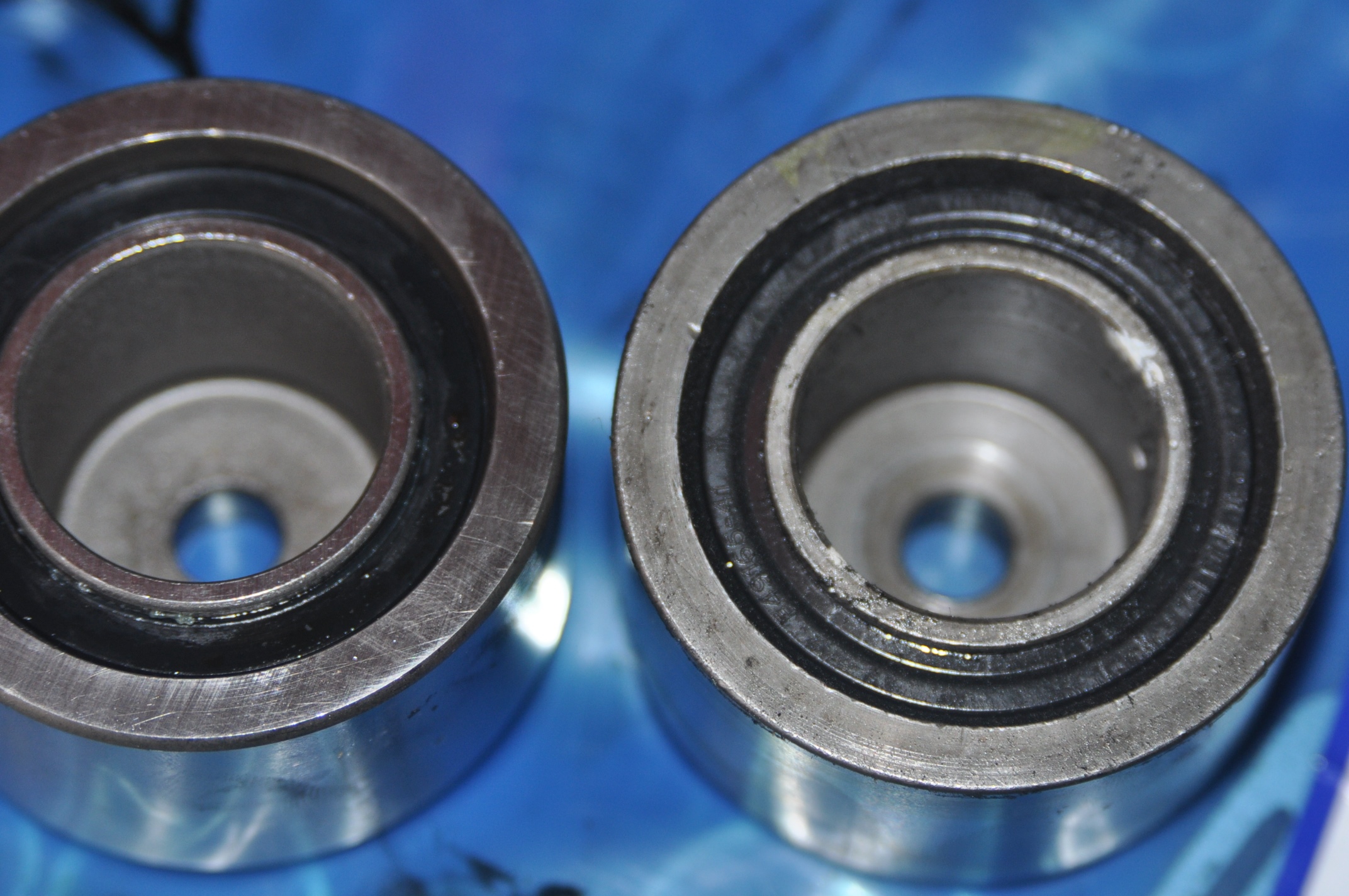 Donc à partir de là, je vous laisse logiquement imaginer les combinaisons d'erreurs possibles... Mais si on a la rondelle en stock, on peut choisir de la mettre ou non en fonction du type de galet dont on dispose, car les deux peuvent se monter dans le trou de pivotement du galet tendeur, car la rondelle ou l'épaulement sont de même diamètre et de même épaisseur.