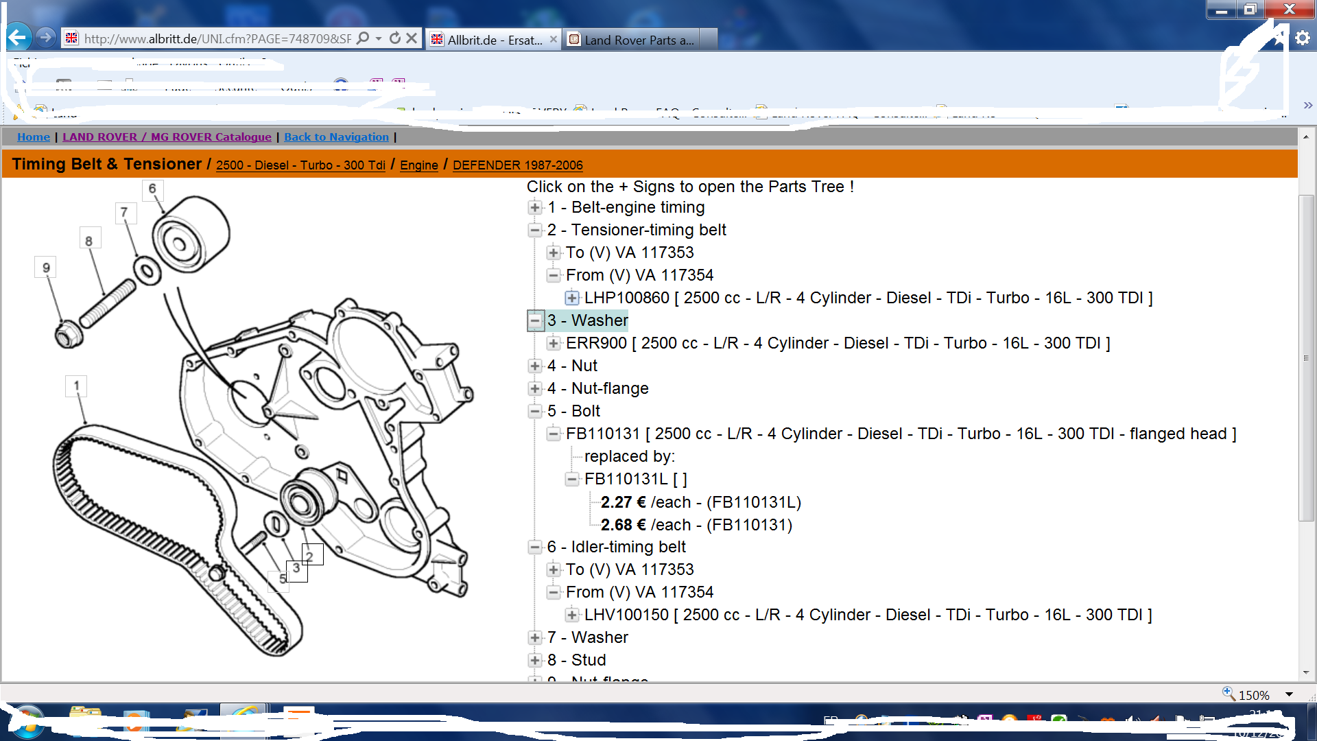 R31) L’expérience faite, c'est possible, mais c'est vraiment bancal: R32) La bonne position du galet tendeur, avec les positions de la course de réglage de tension min/max. On peut voir que l'axe de pivotement de la platine se fait autour d'une grosse rondelle entretoise, située sous le galet fixe. R33) Attention! Ce système de pivotement était sur les premiers 300TDI ensuite cela a changé. R 34) Pour les références et les numéros série des lands pour le changement, rien ne vaut un site marchant: R35) Je me permet d'insister sur cette différence, car de nombreux marchants sont ignorant et parfois peu scrupuleux. J'ai assisté a une casse de distribution pour cette cause, un nouveau galet monté a la place d'un ancien, mais avec la rondelle entretoise conservée, elle était là, on la remet là, sans, faire un comparatif des pignons fixe avant montage. Allez... a tout cassé, et c'est le cas de le dire, cette distribution avait fait moins d'1km.