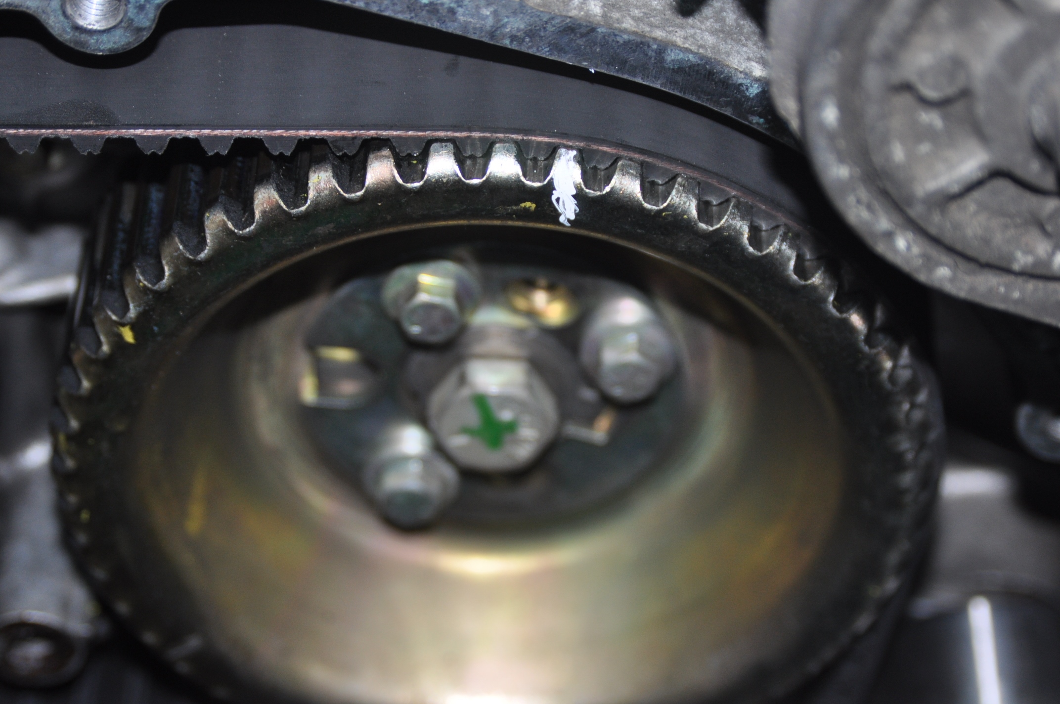 Cette fois si je dirais que celui qui a fait le montage n'a pas bien vérifier que le galet fixe s'est bien mis dans la platine, et le galet fixe s'est posé sur la platine. Le galet fixe est donc, après serrage déporté vers le couvercle de distribution externe de l'épaisseur de la platine, avec en plus une légère mise en travers.