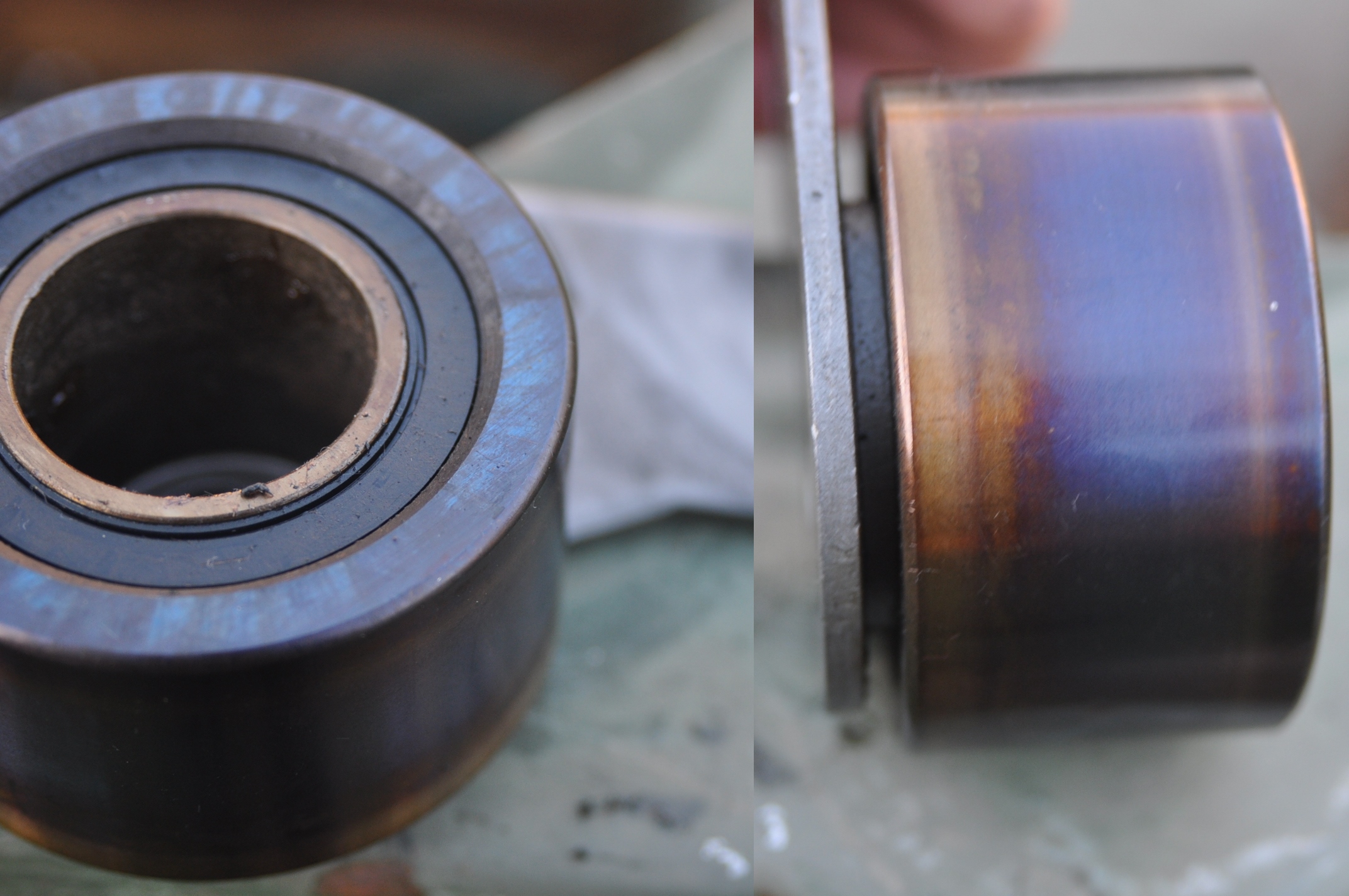 on decouvre que le galet tendeur a aussi chauffé sur toute sa périphérie (photo R58) et pourtant on ne voit pas de frottement de ce galet tendeur sur le carter (photo R50)