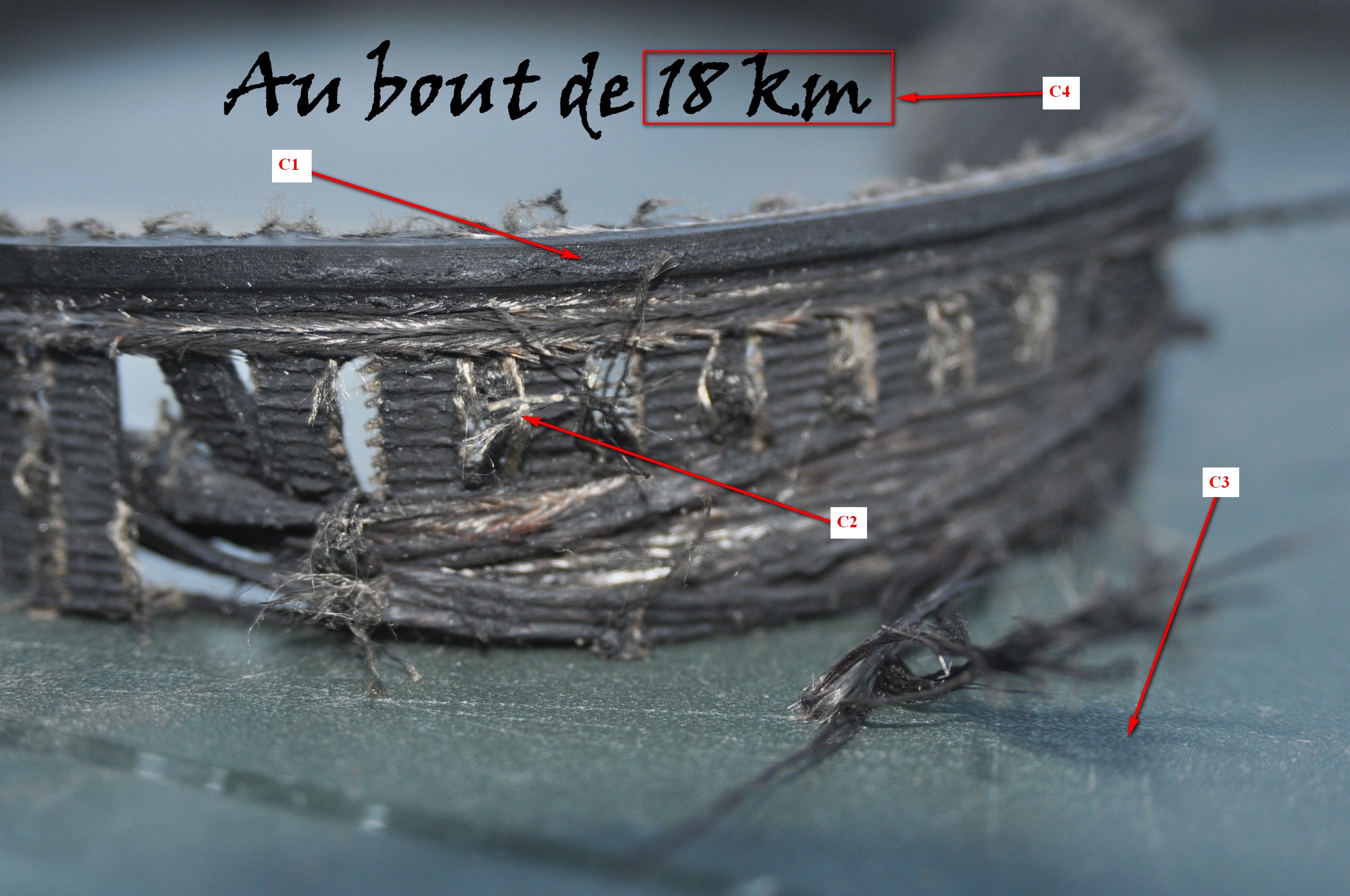 C1: On voit ici que la courroie est usée sur toute sa largeur, sauf une partie, mais on ne sait pas si c'est l'extérieur ou l'intérieur. On verra plus loin que ça n'a aucune importance.