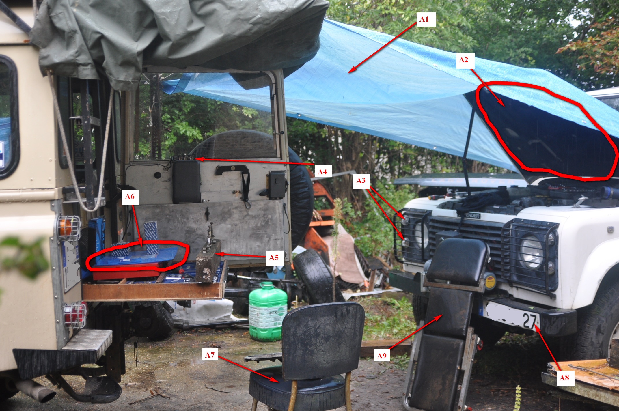 A7: ici on constate la présence de liquide sur une chaise. Sans plus d'informations, il pourrait s'agir de fluides utilisés sur un véhicule, de déjections animales (on ignore si un chien est présent sur le lieu de l'opération) ou humaines, mais nous verrons plus bas qu'il s'agit probablement d'eau de pluie ou de neige fondue, étant donné que la bâche bleue (dans le cas où elle servirait à protéger des précipitations) a été mal positionnée par rapport à la chaise. Il pourrait aussi s'agir de boissons (alcoolisées?) renversées par accident lors de la beuverie de la soirée précédente.