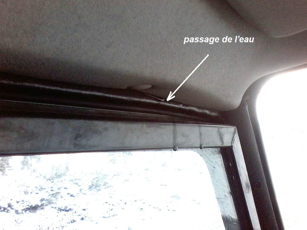 Le problème de départ, c'est le drain de la gouttière. Il est situé juste au dessus de l'endroit de ta fuite. Sur les Serie's le drain était était devant , sur le pare-brise, car la gouttière faisait le tour sur l'avant.