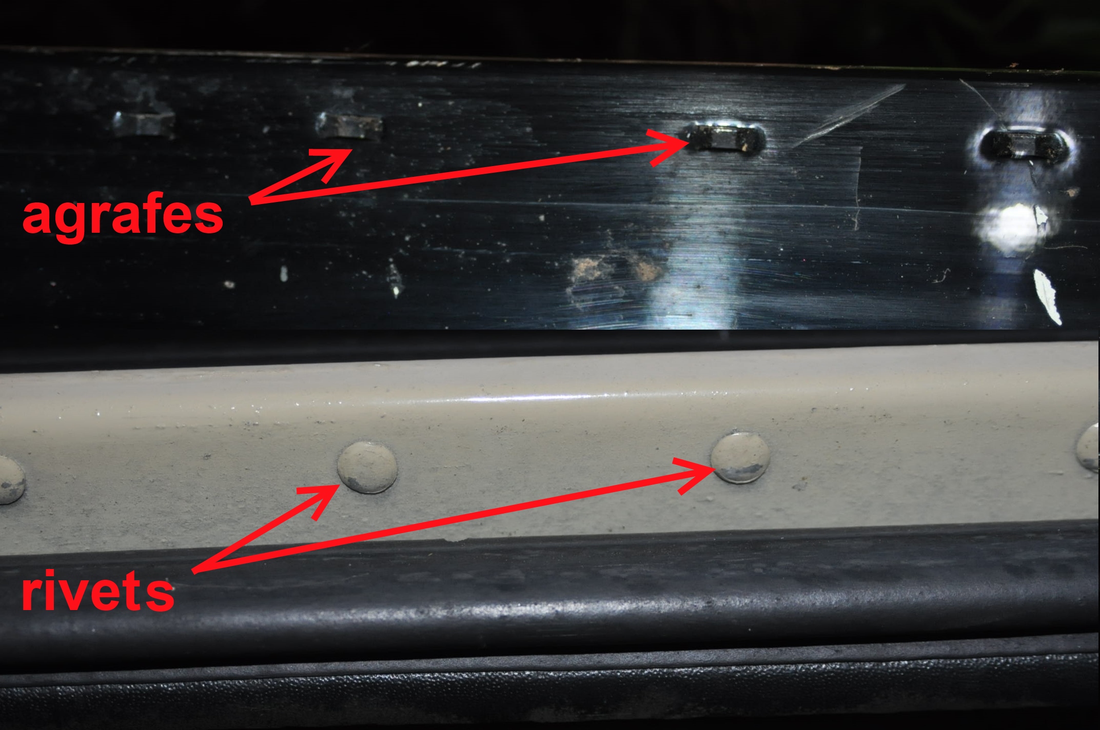 1) Réglet de renfort 2) Renfort a la jonction des deux toits. 3) Trou pas d'origine, pour la fixation d'une poignée de maintien. 4) Les anciennes gouttières rivetées étaient galvanisées et non compartimentées. Si besoin d'autre photo, c'est possible.