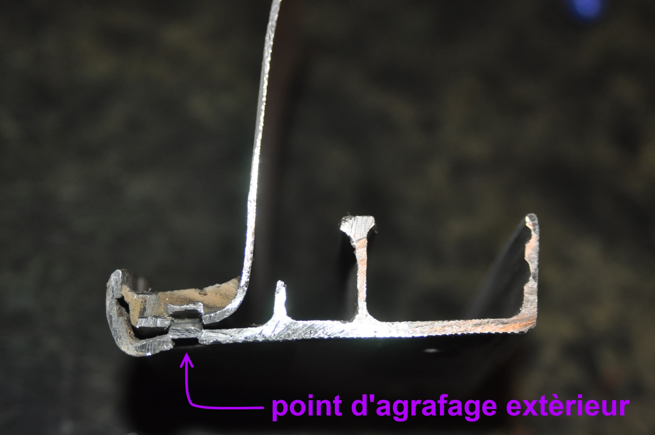 Une coupe d'une gouttière agrafée qui déjà représente un énorme progrès d'étanchéité par rapport au modèle riveté.reste juste a savoir par ou elle s'infiltre !