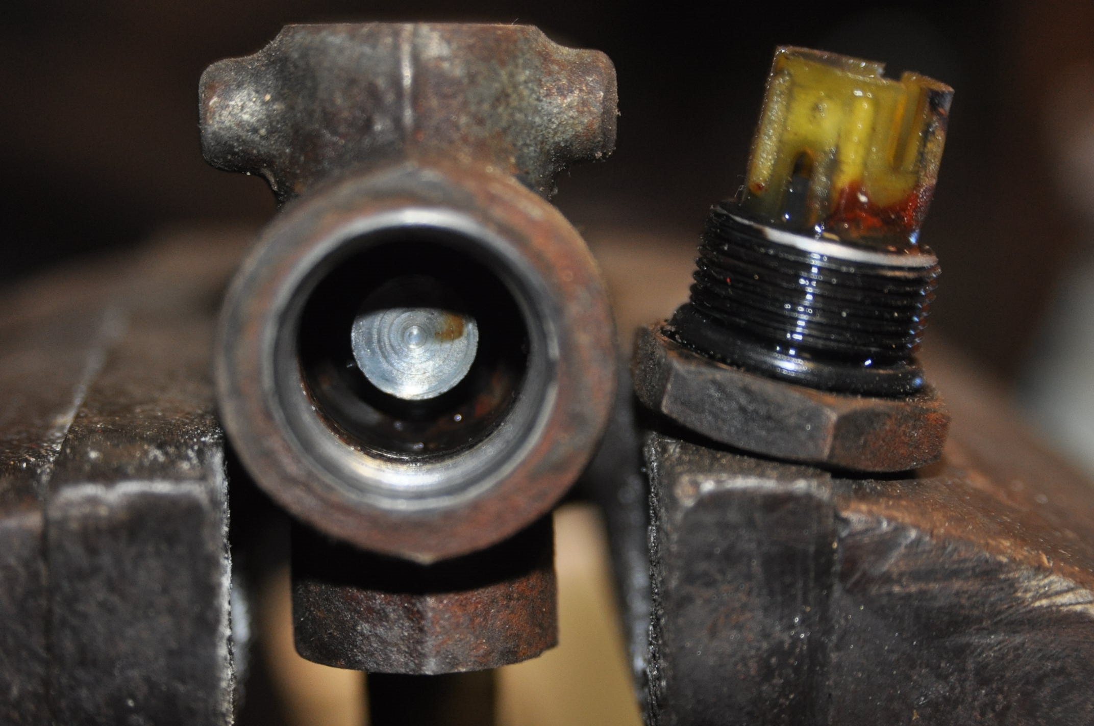 Le piston et le contacteur en position repos: On aperçois par le trou du capteur, le piston en position repos, ou a l'équilibre des pressions dans le circuit avant et arrière, l'encoche centrale est au centre. En position déséquilibré avec fuite sur le circuit avant, donc le piston se déplace vers le cotè où il y a le moins de pression. Cela a pour effet d'établir le contact qui va provoqué l'allumage du voyant. Donc, titi il faudrait contrôler que le circuit du voyant fonctionne correctement c'est à dire que le voyant de frein s'allume si tu fais la liaison avec un petit bout de fil.torero a écrit : Normalement, tu dois avoir un dispositif avec un piston alimenté par le circuit avant d'un côté et le circuit arrière de l'autre côté. En cas de fuite sur un circuit, le déséquilibre de pression fera déplacer le piston qui actionne alors un contacteur pour allumer un voyant au tableau de bord.