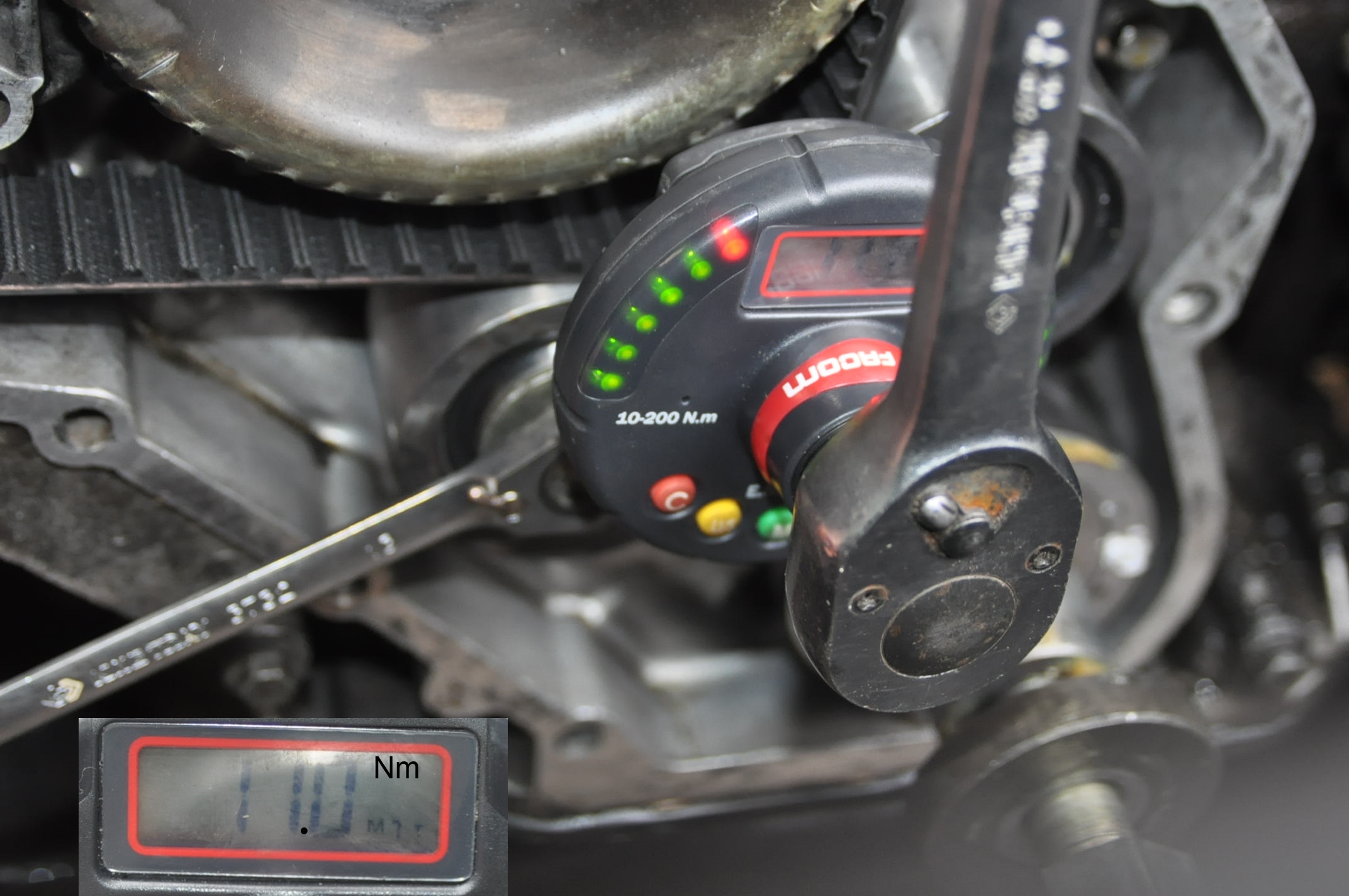 (Sur la photo de LØLØ, la bonne tension de la courroie est obtenue quand la rainure est en face du trait de 50 Nm car il est réglé vers les 61 à 63 Nm)