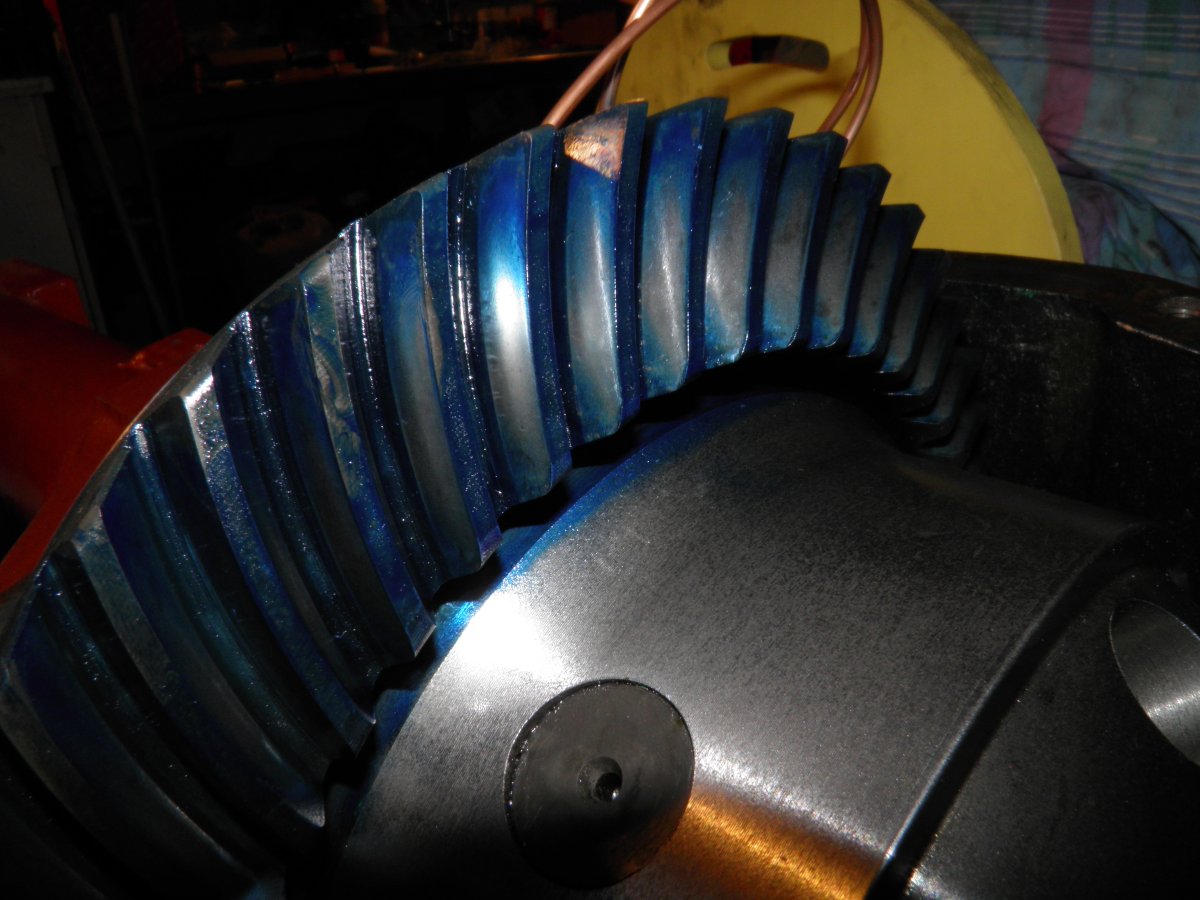 Traces bleues : il y a pas mal de reflets, donc la lecture est moins facile. Néanmoins les traces sont mieux réparties et ce sur la face concave comme sur la face convexe des dents de la couronne, ce qui indique une distance conique correcte. En augmentant un poil le jeu d'entredents, tu pourrais faire reculer la trace vers l'extérieur de la couronne (portée au talon). Ce faisant, tu égaliserais les portées.