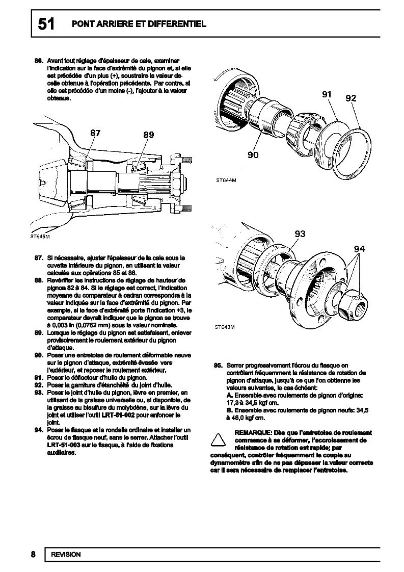 2°) la valeur du couple résistant final du pignon d'attaque donnée par la doc (ce que tu as cerclé de rouge) comprend également l'effort résistant du joint à lèvres + un surcroit de précontrainte aux roulements de pignon qui sera nécessaire pour la bonne tenue des roulements sous charge réelle, mais qui est inutile pour la manipulation du pignon à la main. Ce n'est donc pas la même chose que la valeur du 1°). Et c'est cette phase que tu peux répéter autant que tu le souhaites pour approcher la distance conique te donnant la meilleure portée de denture ;