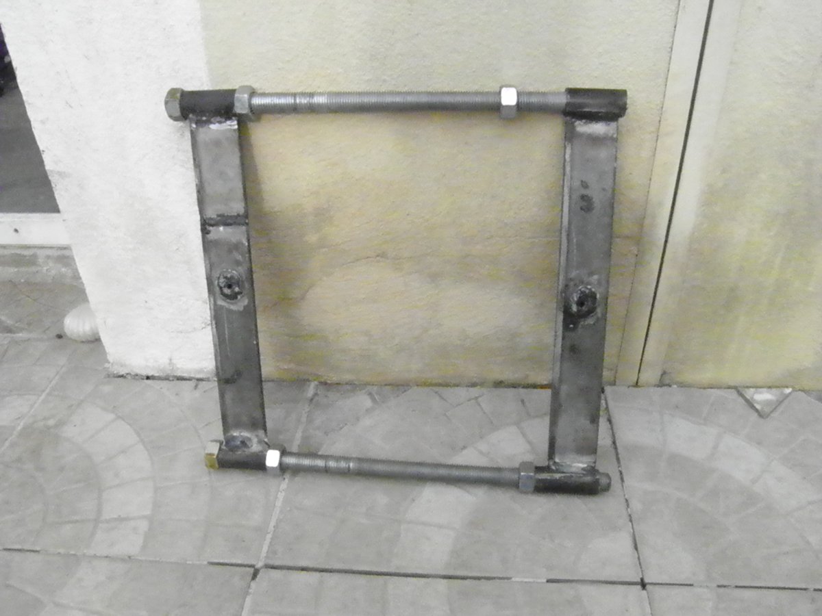A partir d'ici, un écarteur de pont est indispensable. J'ai fabriqué le mien avec deux tiges filetées de 16, de bonnes barres d'acier (on peut utiliser des cornières) avec des bouts de tubes soudés à leurs extrémités, dans lesquels les tiges peuvent coulisser. Au milieu de ces barres, j'ai soudé deux tétons réalisés avec à partir d'un vieux croisillon, ils viennent se prendre sur les trous prévus dans le corps de pont. Avec quatre écrous, c'est parti ! J'ai oublié de prendre une photo, mais si ça intéresse quelqu'un, je le ferai.