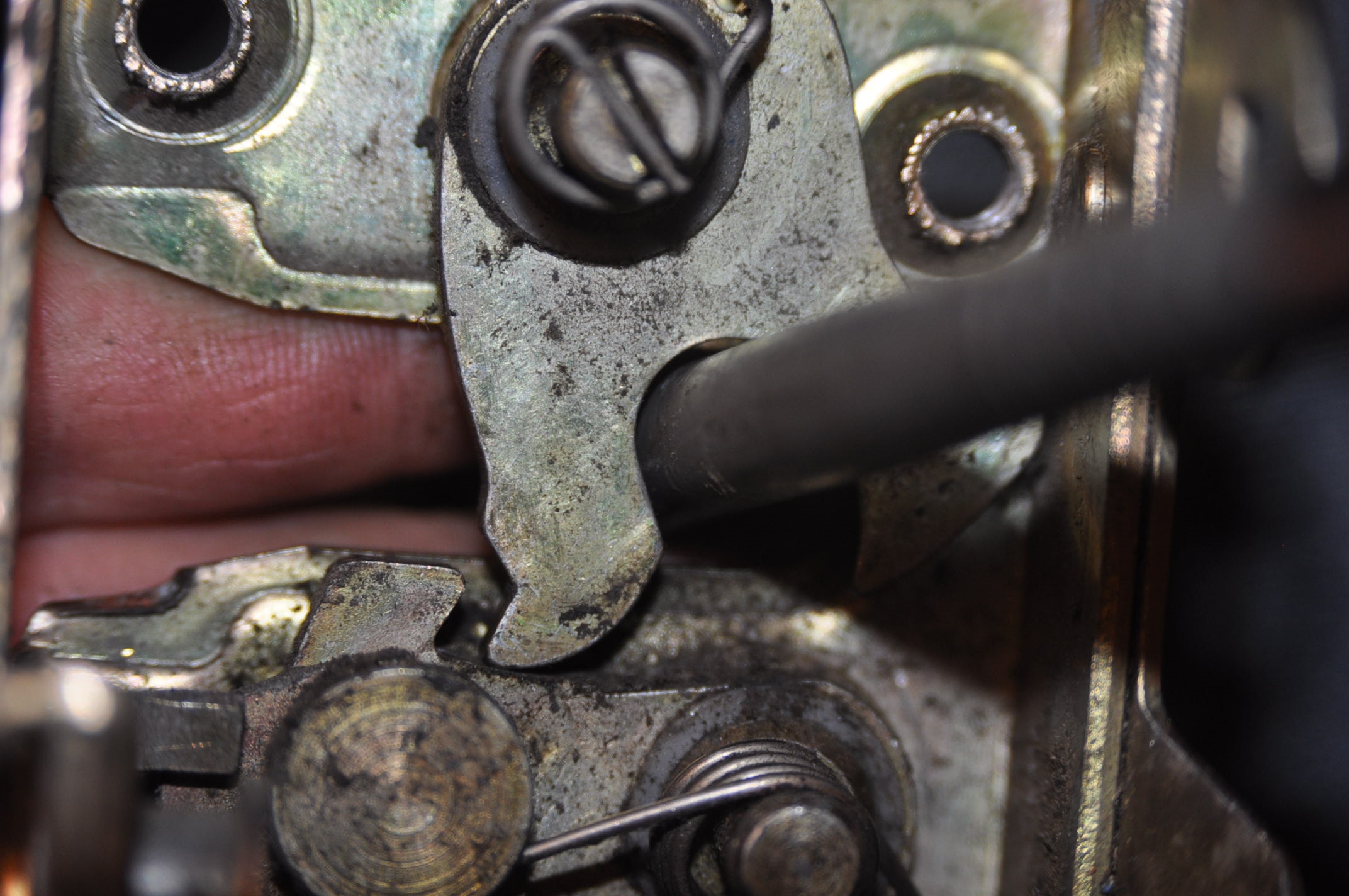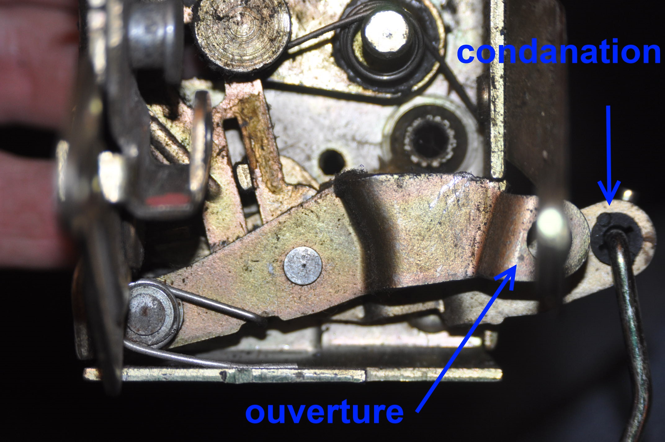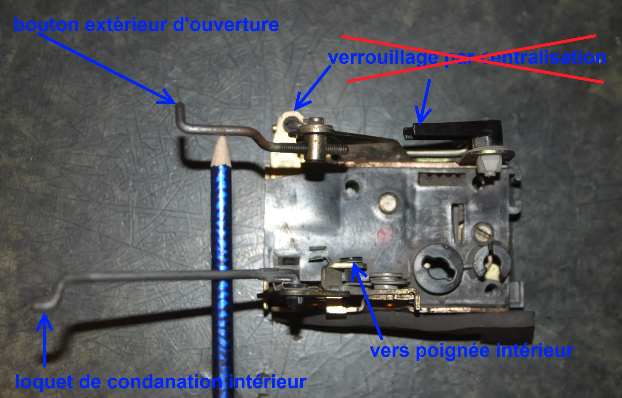 Il y a deux possibilités d'ouvrir soit par le bouton extérieur, soit par le levier intérieur, heu.. Oui cher Docteur Watson, mais vue que c'est une serrure arrière, il n'y a qu'une possibilité de condamnation, car trop récent pour avoir une serrure à clef externe et trop vieux pour avoir une centralisation, élémentaire docteur, il s'agit d'un loquet en plastique noir manœuvrable au doigt de l’extérieur par l'usagé, qui va venir actionner une tringlerie d'une dizaine de centimètre, un peu comme en bas à droite sur la photo, mais de l'autre coté et perpendiculairement voyez ce que je veux dire