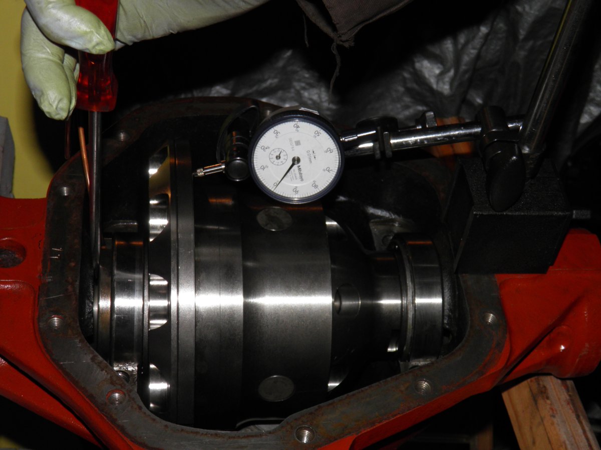 C'est à ce moment-là que je me suis rendu compte que deux parties du corps de pont gênaient : les deux petites protubérances sous les roulements de différentiel. Il faut donc sortir la disqueuse et "raboter" un peu tout ça : Ensuite, il faut surtout faire attention de ne pas basculer le bloc pour ne pas fausser la mesure. Cela ne se voit pas sur la photo, mais j'ai du remettre, sans les bloquer, les chapeaux de paliers tellement le différentiel "bascule" vite. Dans mon cas, le jeu mesuré est de 2,2 mm. Il faudra ajouter 0,127 mm (la précharge) pour obtenir l'épaisseur totale des rondelles d'épaisseur à mettre en place (valeur A).