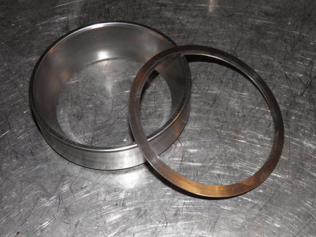 En fait, j'ai dans un premier temps extrait seulement la bague intérieure et les rondelles Tous mes essais de réglages ont été faits avec l'ancien roulement extérieur, car celui-ci n'a aucune influence sur la distance conique, mais il peut subir, comme ce fut le cas ici, de nombreux montages et démontages qui pourraient l'endommager.