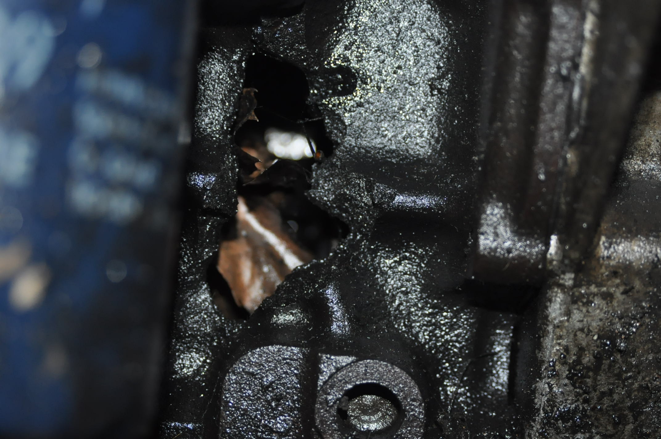 Bien que l'on ne voit pas très bien, à gauche flou en bleu: c'est le filtre à huile; à droite couleur alu huileux: le carter d'embrayage, et entre les deux un trou laissé par une bielle qui a jouer les filles de l'air...