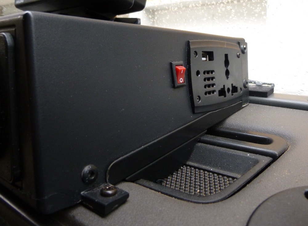 Cela fait j'ai installé les manos et le voltmètre et il restait pas mal de place dedans. Puisque je n'aime pas le vide j'ai cogité un peu sur ce que je pouvais y ajouter et je me suis dit qu'une prise allume cigare serait utile pour le GPS à côté. Par le suite, j'ai récupéré un transfo 12 - 220v que j'ai intégré au côté droit. Le transfo ne fait que 150w mais c'est largement suffisant pour y brancher un netbook, une tablette ou les chargeurs d'accus d’appareil photo.
