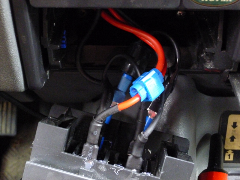 - + permanent pour la prise allume cigare du GPS et le transfo avec un interrupteur dédié pour celui-ci. L'ensemble peut être coupé par un interrupteur placé sur le tableau de bord (interrupteur "aviation" rouge sur la photo. (le bleu à côté c'est pour la pompe à eau qui est dans le coffre histoire que le robinet ne puisse pas s'enclencher sur une piste un peu trop "remuante").