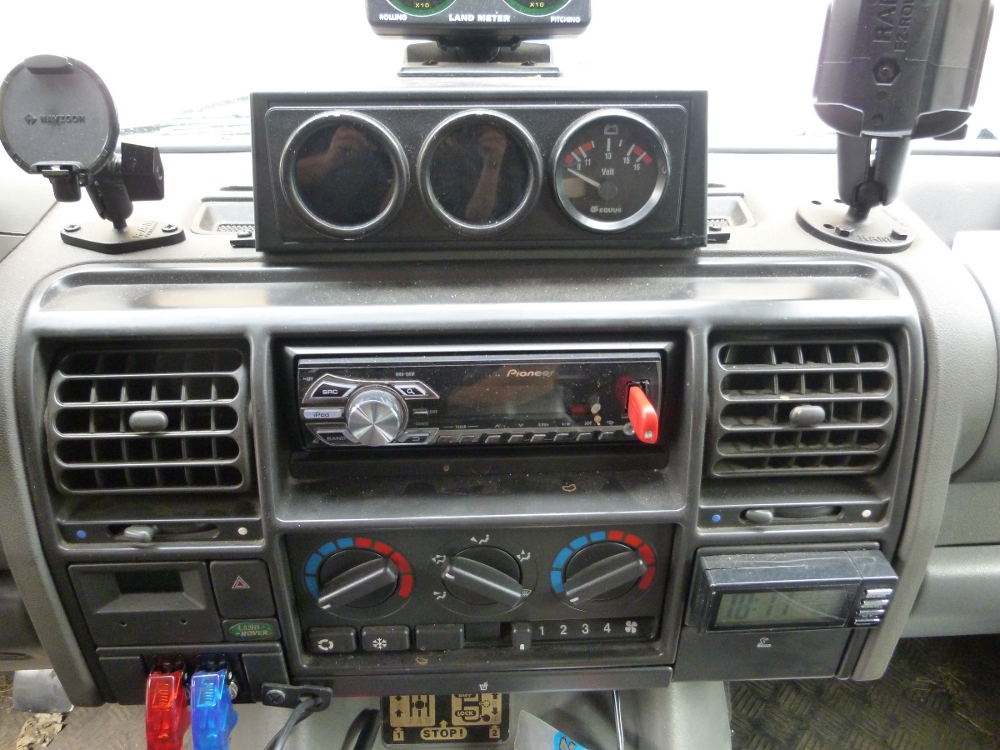 - + permanent pour la prise allume cigare du GPS et le transfo avec un interrupteur dédié pour celui-ci. L'ensemble peut être coupé par un interrupteur placé sur le tableau de bord (interrupteur "aviation" rouge sur la photo. (le bleu à côté c'est pour la pompe à eau qui est dans le coffre histoire que le robinet ne puisse pas s'enclencher sur une piste un peu trop "remuante").