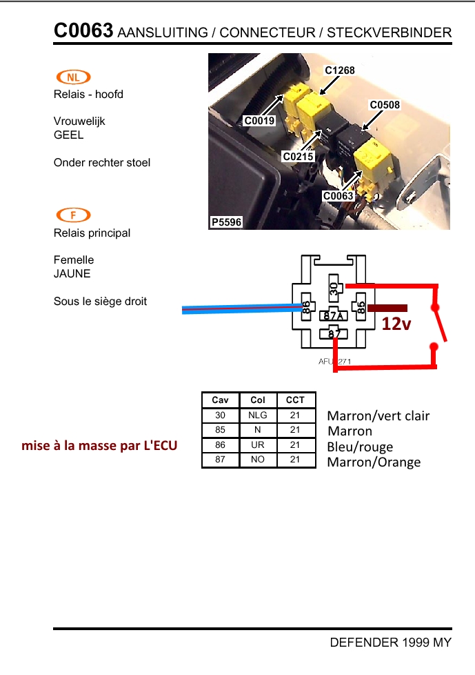 Sur la doc constructeur du relais jaune, C0063 est situé sous le siège passager, a cotè de la boite de fusible, pour être sur que tu as affaire au bon relais fis toi à la couleur des fils. Car évidement il peut y avoir une ambiguïté quant à sa position.