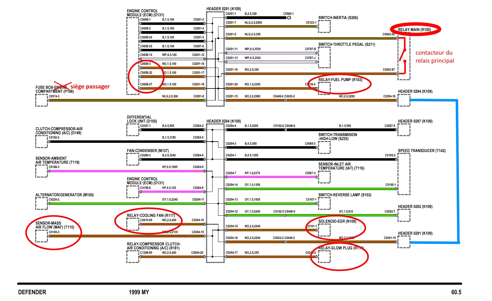 Extrait de schéma TD5 de 2002, mais c'est le même pour un land de 99: Mais pour l'instant, je vais arrêter les hypothèses, tend que les deux connecteurs bleus K109 (C0291 et C0294) n'auront pas été ouvert; inspecté et photographié.
