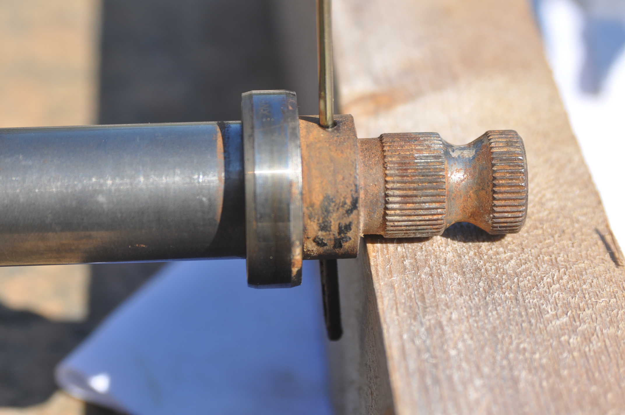 Bon, on démonte et on regarde: Puis après nettoyage et reconstitution, on passe à l'anthropométrie dans l'espoir d'une identification. Malgré les mesures, je n'arrive pas à établir un lien entre celles ci et le marquage ? Après le nettoyage du corps mené à la baguette... Le graissage du roulement avec de la NLGI 2 Remise en place au doigt d'abord, puis à l'aide d'un tube PVC de Ø30mm en tapotant avec le rigolo, en m'alignant sur la marque ronde laissée dans le caoutchouc du roulement par les trous de 6mm en bout de la colonne. Le contrôle de l'enfoncement, donne bien les 10mm préconisé dans la doc au point 32. Remise en place du roulement du bas sur l'axe centrale de la colonne, qui au passage avec ses 2,9kg ferait entre les mains d'un armurier pakistanais un excellant canon lourd pour sniper. Puis remise en place du canon dans son fourreau si je puis dire, à l'aide d'un geai en bronze simple au début... Puis le geai a été légèrement modifier, afin de pouvoir enfoncer le roulement à fond en butée, pour bien libérer la gorge du clips en ne tapant uniquement que sur la bague extérieur du roulement. Remise en place du clips, pas de difficulté majeur, avec une bonne pince. Au passage le clips à un diamètre de 38mm. La caisse à outils spéciaux si on a de la chance: