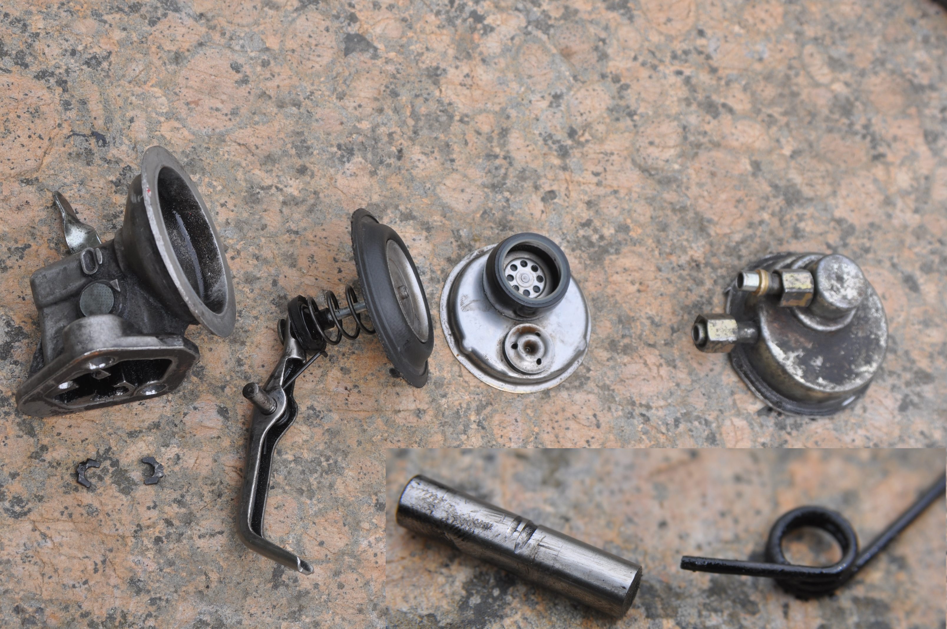 J'ai déjà eu le cas sur une pompe de 300tdi également, sur ce modèle qui malheureusement n'est pas démontable autrement que de façon irréversible: Au démontage, j'ai trouvé une petite rondelle dans le corps de pompe, heureusement que celle ci n’était pas passé dans le bloc. Pour comprendre ce qui s'était passé, j'ai dut ouvrir la pompe à la meuleuse: A l'ouverture la membrane sort un peu trop: Le bout de l'axe de commande de la membrane: Dans la partie supérieur de la pompe, on a dans le clapet anti retour d'entrée coté réservoir quelques saletés, sous forme de copeaux de caoutchouc et apparemment un petit bout ressort. La grosse rondelle caoutchouc sert à compartimenter en deux zones la partie supérieur de la pompe, ainsi on a l'entrée dans la rondelle et l'espace destiné a la sortie autour. Sous la membrane coté moteur si par le trou on voit des traces d'huile c'est que le caoutchouc sous le ressort, autour de la tige de commande de la membrane est HS. Si par ce même trou on voit des traces de GO, c'est que la membrane est HS. Et parfois selon les modèles de pompe, le GO arrive a passer dans l'huile moteur par là, cas des pompes sur les 2l¼. En faisant la mise au point au fond du corps de la pompe, on comprend la forme de la marque d'usure sur la petite rondelle, et la cause de la panne. Le sertissage de l'axe sur la rondelle à cédé sous l'effet de l'usure. Le démontage du levier est lui aussi presque irréversible. Voilà presque tout les constituants sur la table. On peut voir une belle usure sur l'axe du levier de la pompe qui avait environ 200000km. Un semblant de remontage de l'ensemble de la pompe de relevage. Malgré l'autopsie de la pompe, et le nombre de photos, je reste sur ma faim, car je viens de réaliser, que je ne sais pas comment le levier d'amorçage manuel agit sur le levier principale de la pompe, malgré les 89 photos du dossier. Alors que souvent on a le soucis de la position de la came de l'arbre à cames pour actionner correctement ce petit levier de pompage manuel qui fonctionne en poussant dessus. Si il est tout moue, c'est à dire que l'on ne ressent pas l'effet du ressort de rappel, c'est que le levier empêche le mouvement de la membrane. Je vais tacher de retrouver la pompe et éclaircir ce point là.