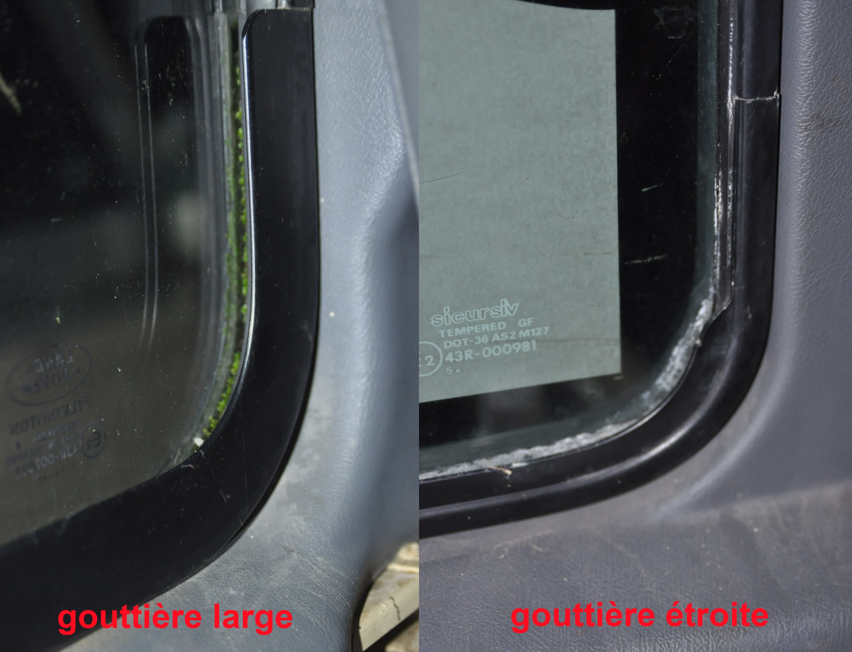 Sur la photo, tu as ton modèle de gâche entouré, ensuite de 84 à 86 voir 87, il y a le second modèle dit espagnol à guillotine, a partir de ces modèles là les serrures des portes latérale d'un SW AV et AR sont alignés, puis le troisième modèle 87-88 à nos jours. En Haut à gauche, c'est une serrure de porte de benne AR. Il faudrait que tu mesures avec précision la hauteur et la largeur de ta fenêtre, mais il me semble que cela peut ce monter. Si tu choisis des fenêtres arrière, prends celles avec les larges rebords intérieur en bas, ce sont les seuls qui ne fuient pas à terme: Mais tiens? soudain à la vue des photos, la mémoire me reviens et pour le coup, j'ai l'impression de radoter un peu, il y a un petit tutoriel sur la faq: changer joint de vitre arriere coulissante defender