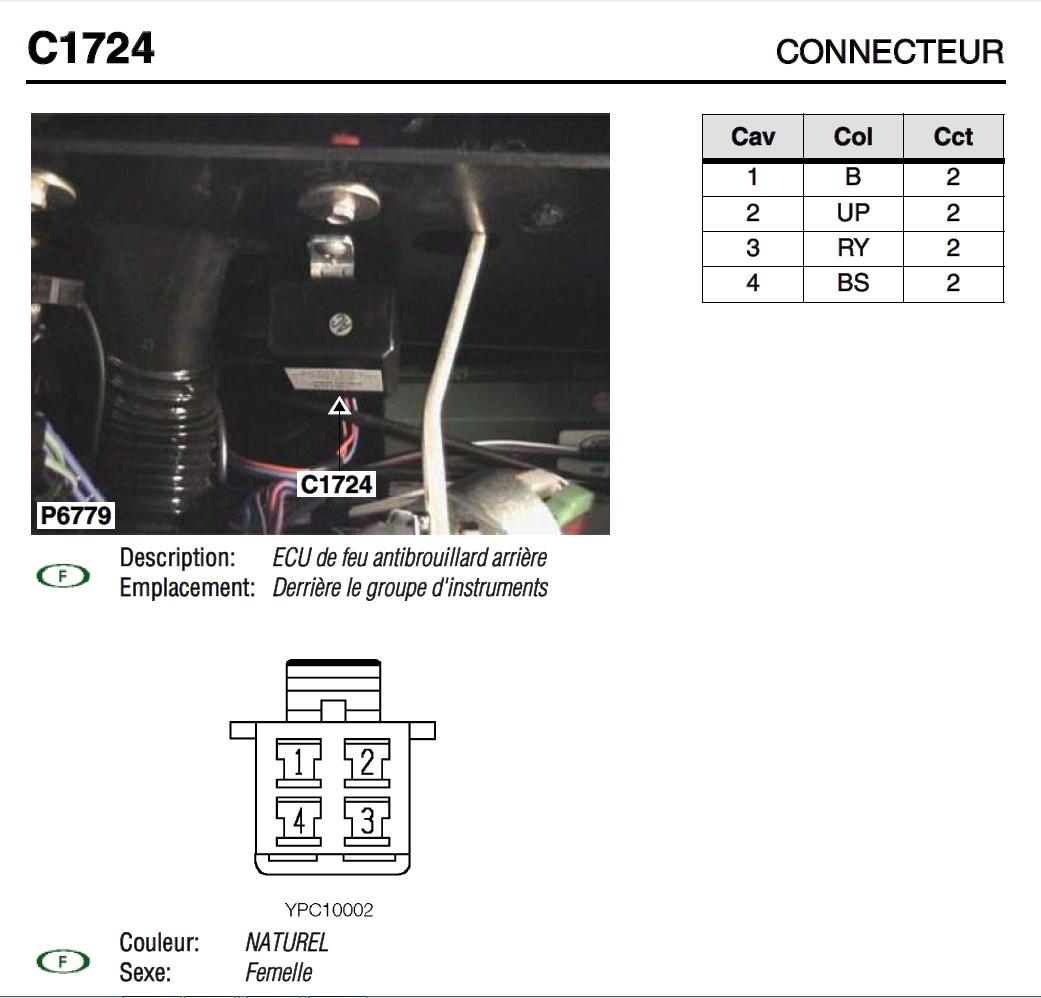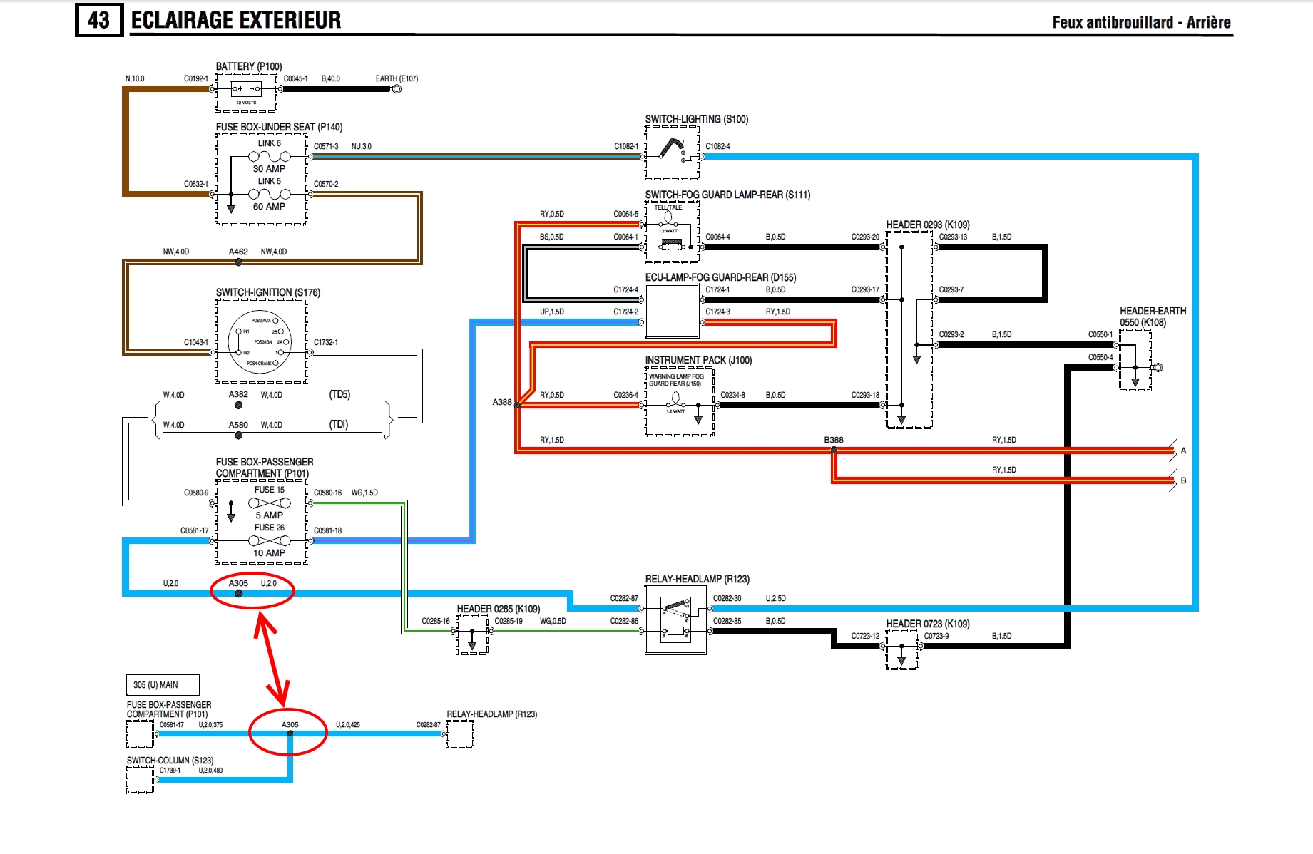 En regardant les schémas correspondant mieux à l'année de ton land, on peut voir une liaison supplémentaire sur le fil bleu, correspondant a l'antibrouillard: Tu peux voir l'épissure A305 correspondant au piquage pour l'antibrouillard: Donc on peut très bien imaginer qu'un défaut dans le feu Anti brouillard, ou dans sa ligne d'alimentation fil rouge liseré jaune, voir même dans la prise de remorque, qui puisse engendrer un échauffement du fil bleu.