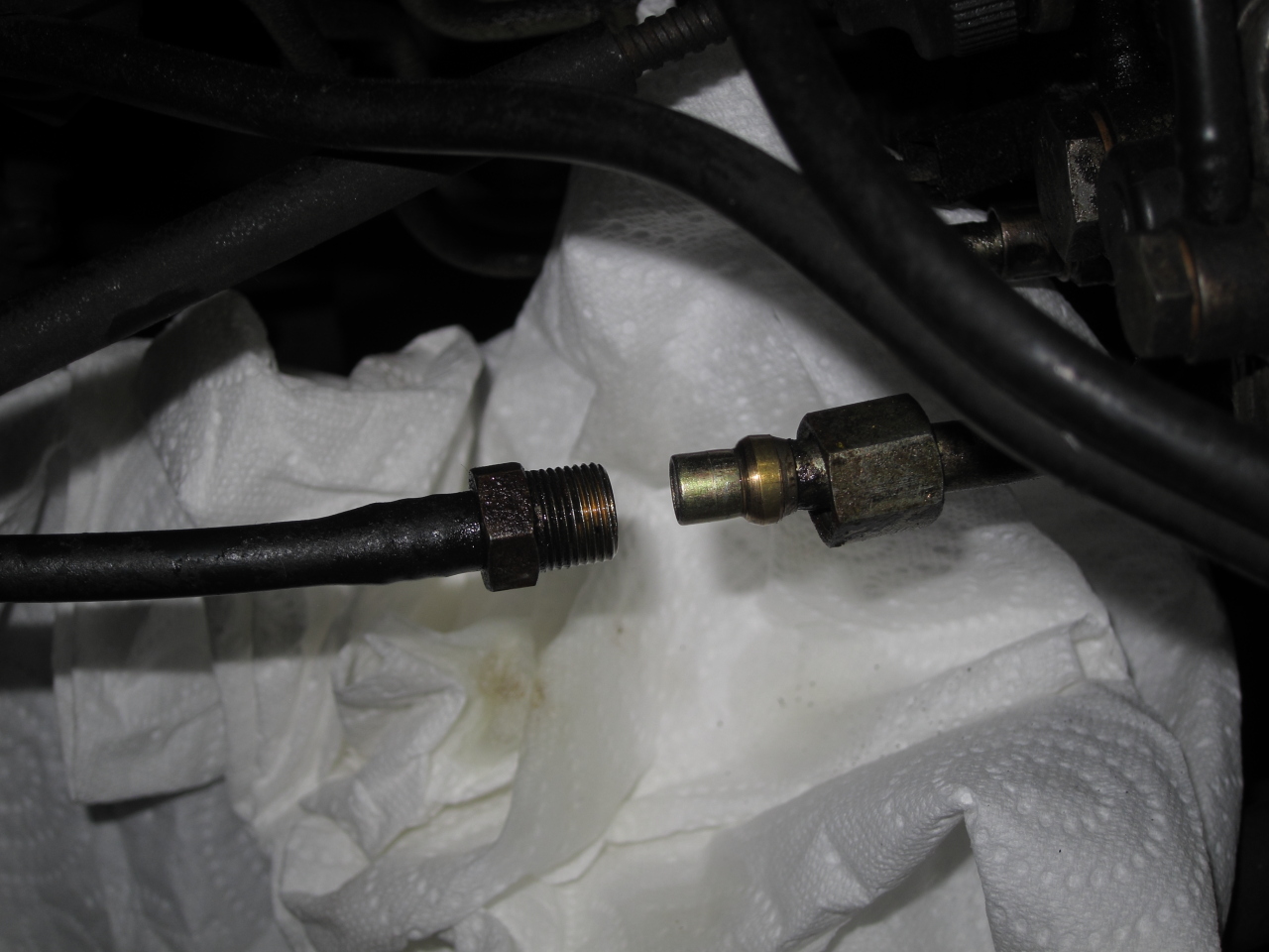 Voilà que lors de mon changement d'axe de commande d'injection, j'ai tout ré-assemblé sans tenir compte d'un probable frottement des tuyaux contre un élément du moteur. Et voilà le tuyaux de retour de gasoil des injecteurs vers la pompe à injection à frotté et s'est percé.