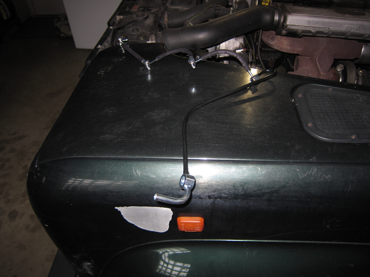Bon, dans l'urgence j'ai replacé l'entretoise en plastique permettant de tenir le tuyau éloigné des tuyaux haute pression et j'ai mis une pâte époxy autour du trou. Comme je n'arrivais pas à bien faire adhérer, j'ai attendu qu'elle durcisse un peu, pas trop et j'ai mis deux serre-flexs.