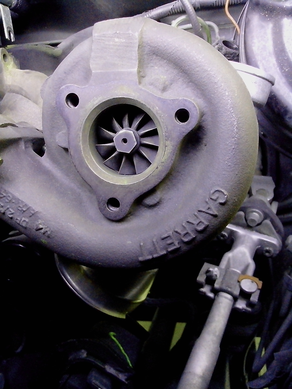 Le turbo de l'espace est légèrement gras côté admission, jeu correct, je ne sais pas si cette huile provient d'un reniflard pourri ou des paliers. Des goujons sont visés sur la bride.