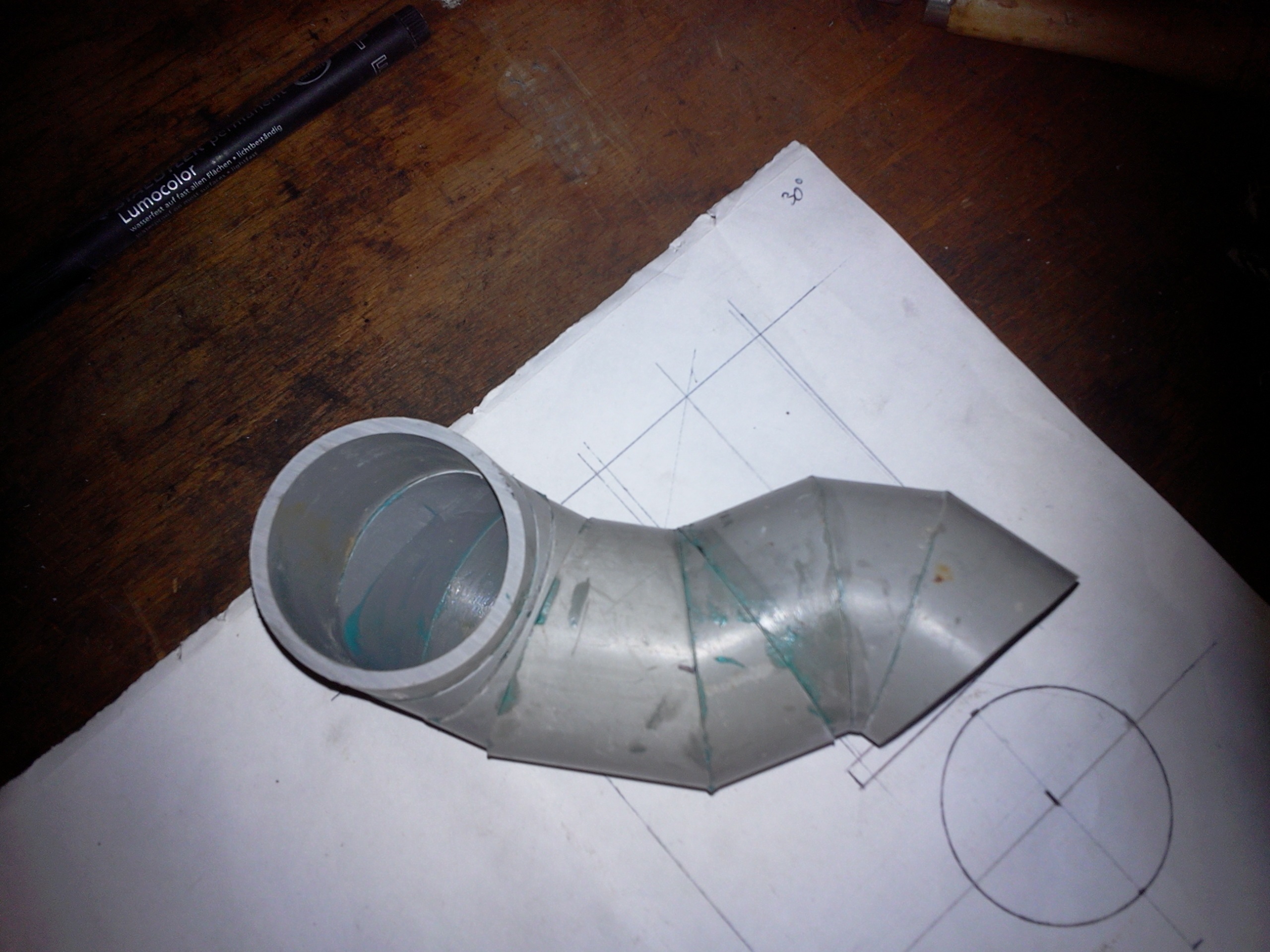 La maquette est en tubes droits, mais il faudrait qu'il y ait une partie conique à un endroit, ne serait-ce que pour se raccorder au tube d'échappement qui est plus gros. L'idéal serait dans le premier coude à la sortie de la turbine, pour éviter un ralentissement des gaz d'échappement. Reste à voir la faisabilité.