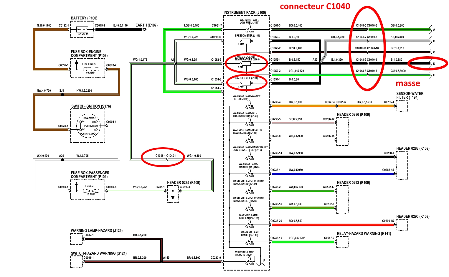 Puisqu'on a l'image avec les connecteurs de tablier, au passage on peut contrôler que le connecteur de tablier de la jauge à carburant (C0378) est en bon état aussi, car si il est oxydé, cela peut-être une bonne cause de panne, vérifie que c'est bien celui de la photo en te référant aux couleurs des fils de la jauge qui arrivent dessus, normalement comme tu peux le voir sur le schéma les couleurs sont vert liseré noir et gris liseré noir.