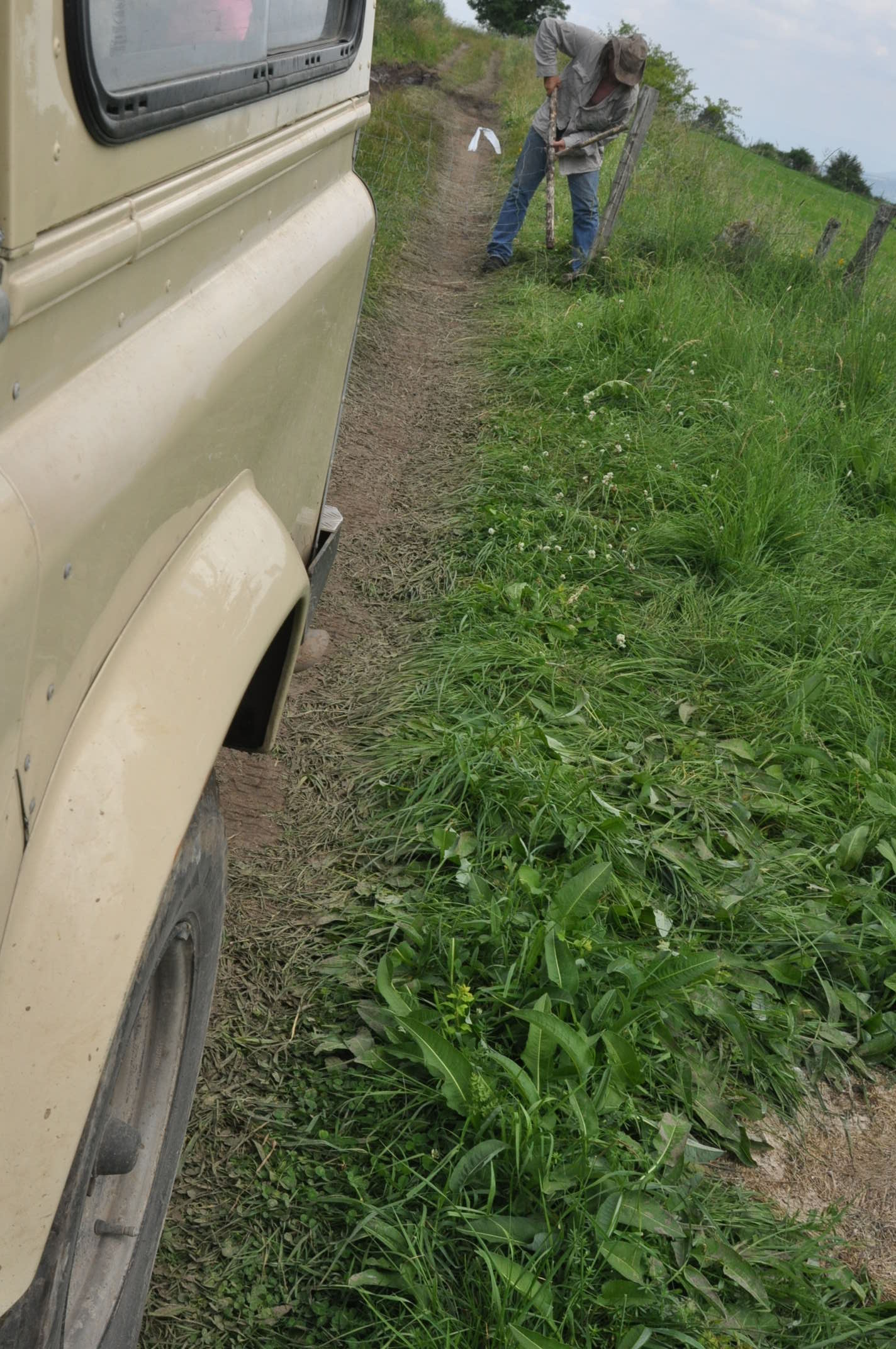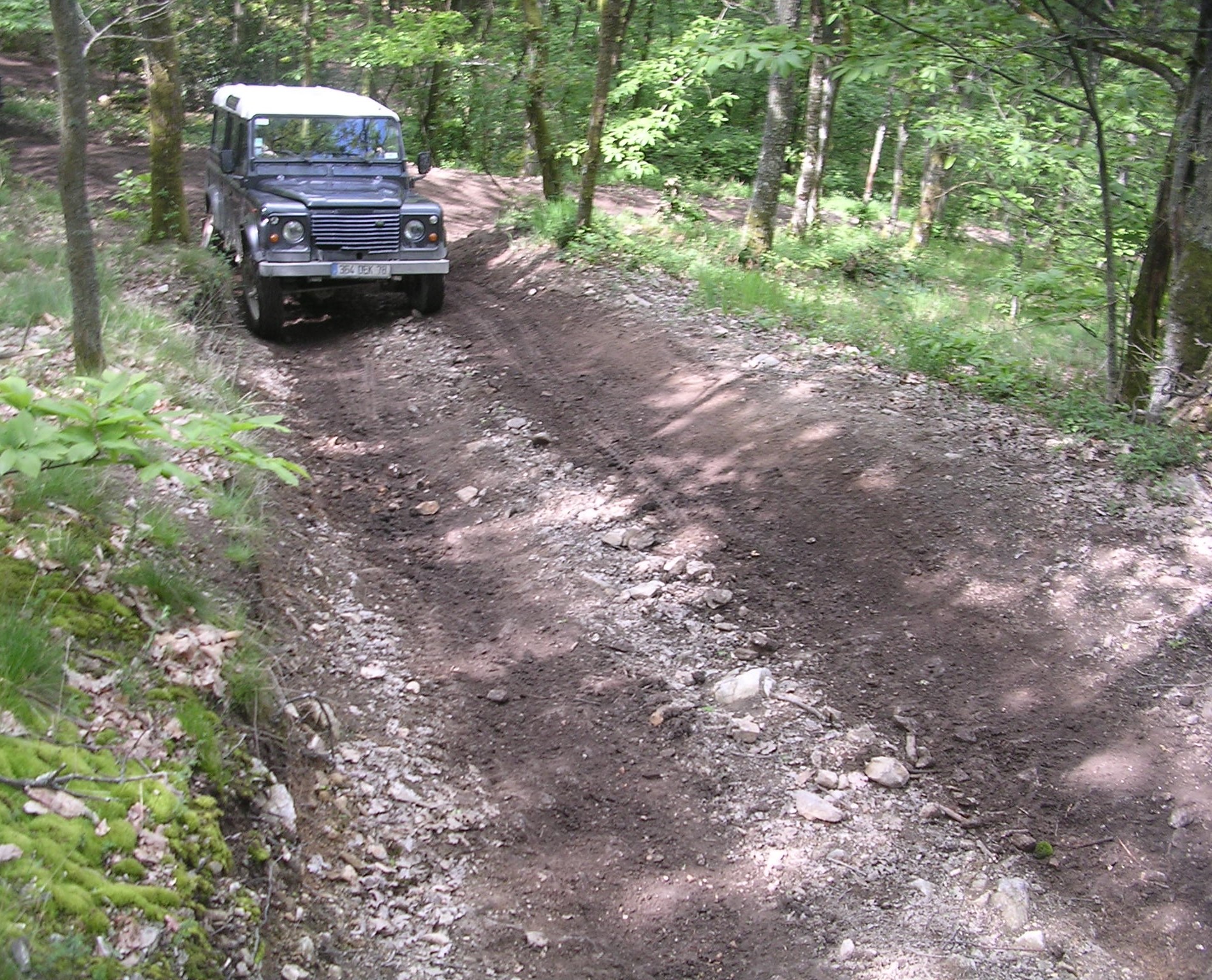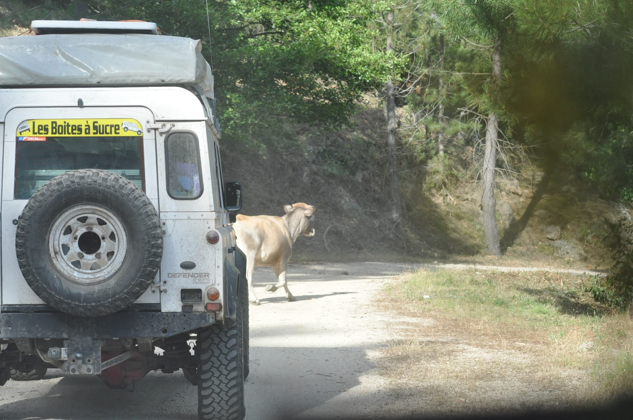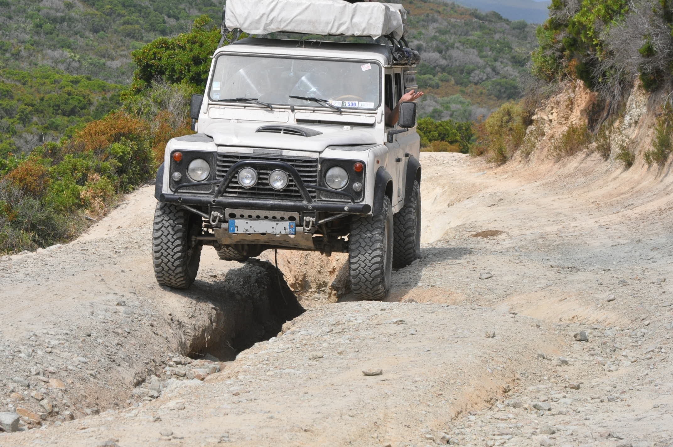 Soit en moyenne une galerie fait environ 50 kg un peu moins pour un 90 peut-être; idem pour une tente de toit comme la mienne, un ou deux jerrycans, ou une malle et on y est. Donc, dès que cela secoue un peu, que cela penche; ou tangue, on ne fait pas le malin... On se dit que pour la prochaine expédition on aménage l’intérieur du land. En attendant, on essais de maintenir le land le plus plat possible en surfant du sommet d'une bosse à l'autre. Sans compter sur les imprévus: veaux; vaches; poulets; sangliers; chevreuils...Qui peuvent surgir de n'importe où, et nous faire faire n'importe quoi...