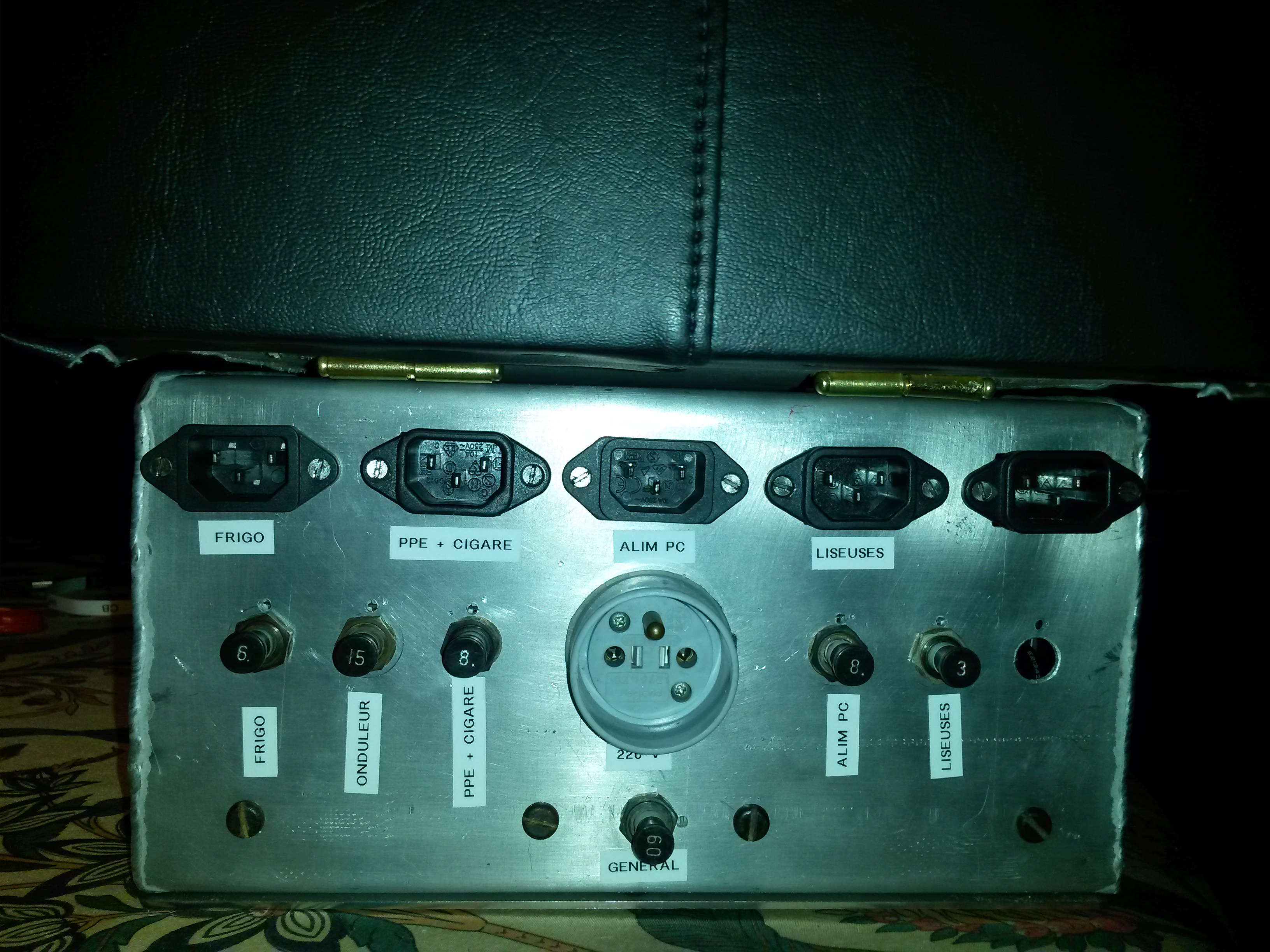 Sur la face arrière, as tu prévu une protection contre les pieds des passagers ? J'ai des mômes avec copains, qu'il est parfois difficile de contrôler lorsque qu'ils chahutent à l'arrière où avec les bottes crottées. Donc toutes les prises et les fusibles réarmables, me paraissent vulnérables.