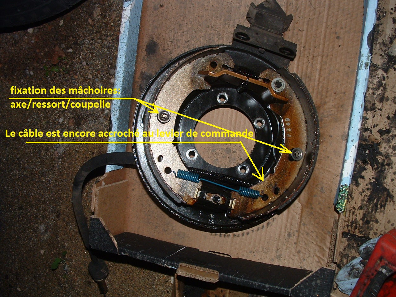 mon câble de frein à main est complètement effiloché coté habitacle et j'essaie d'accéder à l'autre extrémité par en dessous mais grosse galère car il semble que le câble soit maintenu par une bride le long de la boîte de transfert. Savez-vous comment on peut accéder (facilement...) à cette bride et à la maudite goupille qui raccorde le câble à une tige provenant du tambour. Y a t"il une trappe de visite (pas trouvée...) ou bien faut-il démonter tout système de frein à main pour y accéder ?