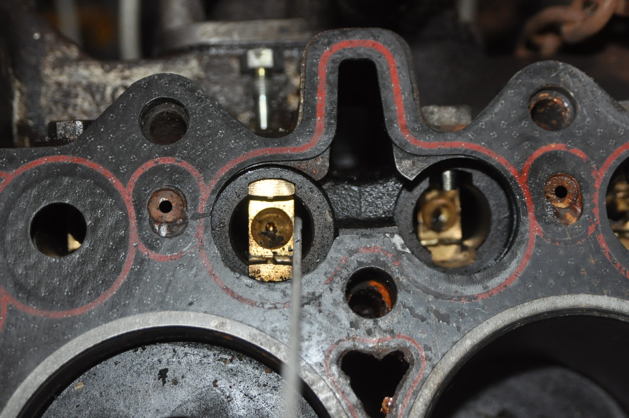 Évidement grand stresser et parkinsonien s'abstenir. Bon, revenons dans la vis du sujet, au vue des traces sur le filetage de laquelle, on peut effectivement voir qu'elle a été montée à la Loctite Oléoétanche 542, peut-être, car je n'ai pas encore eu les résultats du labo suite à un prélevement de son ADN. Vous pourrez constater également qu'il n'y a pas de trace sur la tête, aucune indication permettant une identification fiable. Une tête de coupable toute trouvée, complice du guide cela va de soit. Mais voilà, je propose une solution en faisant tétété à la remarque du manuel d'atelier mentionner par Pater, car pour avoir "toujours fait comme ça" même si ce n'est pas...