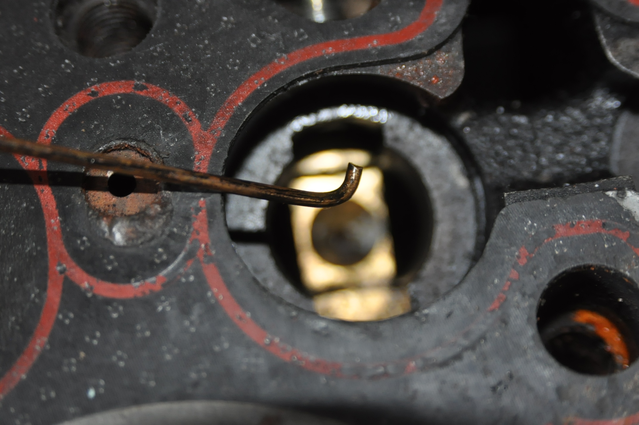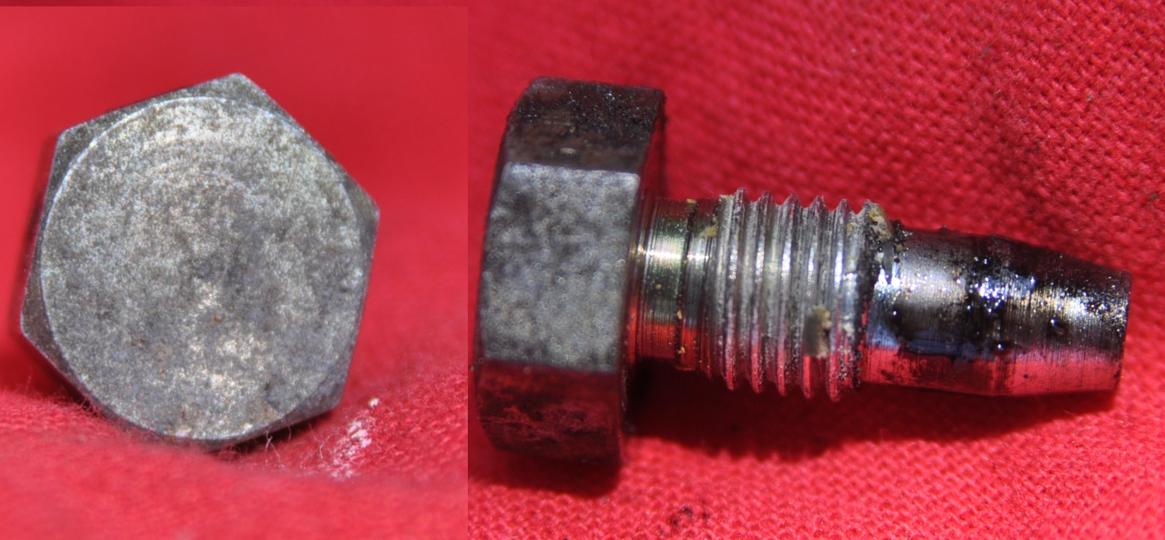 Évidement grand stresser et parkinsonien s'abstenir. Bon, revenons dans la vis du sujet, au vue des traces sur le filetage de laquelle, on peut effectivement voir qu'elle a été montée à la Loctite Oléoétanche 542, peut-être, car je n'ai pas encore eu les résultats du labo suite à un prélevement de son ADN. Vous pourrez constater également qu'il n'y a pas de trace sur la tête, aucune indication permettant une identification fiable. Une tête de coupable toute trouvée, complice du guide cela va de soit. Mais voilà, je propose une solution en faisant tétété à la remarque du manuel d'atelier mentionner par Pater, car pour avoir "toujours fait comme ça" même si ce n'est pas...