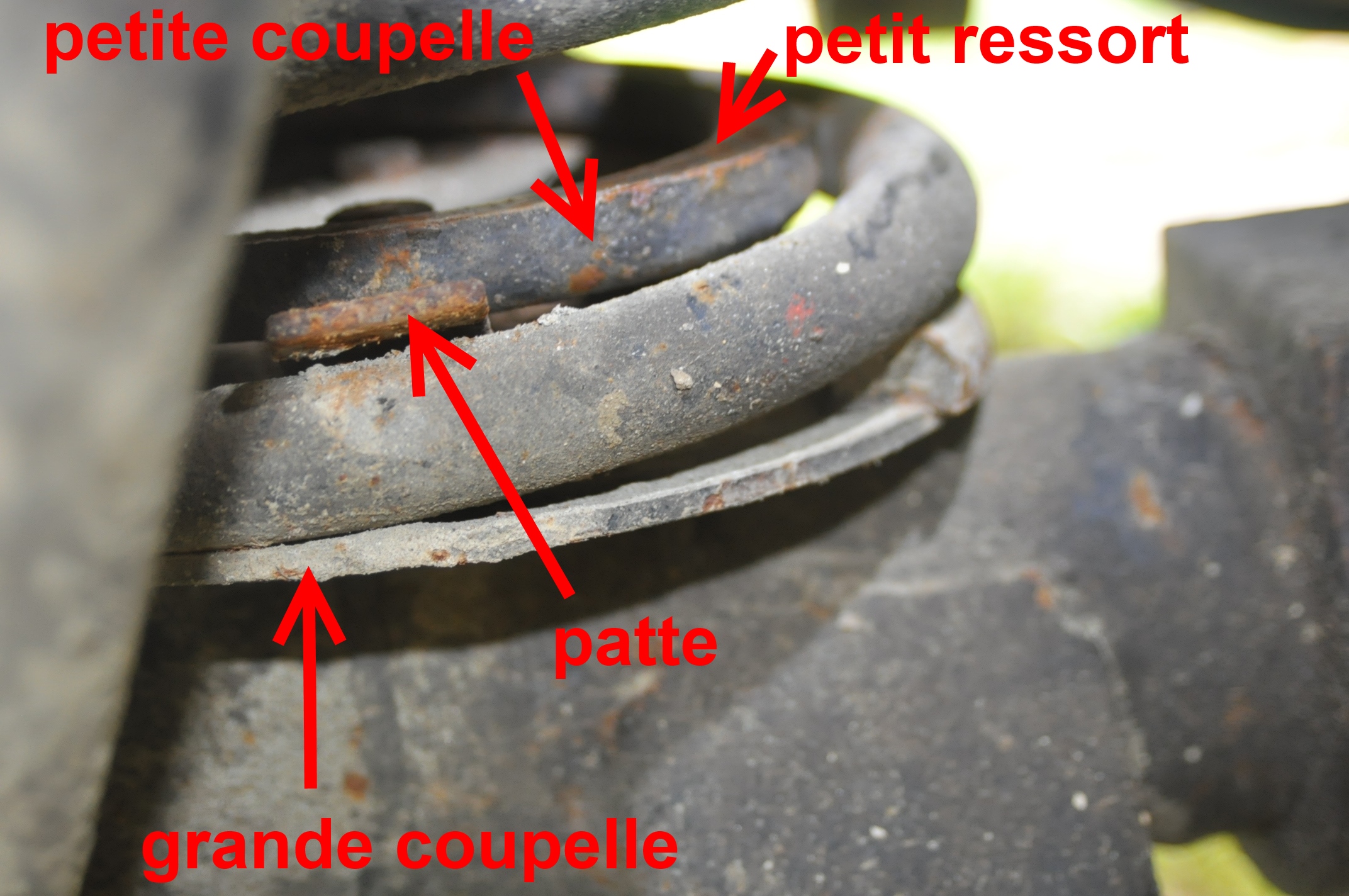 Ce qui t'a peut-être induit en erreur c'est la photo 1) sur laquelle il était possible de confondre la grande coupelle et le petit ressort: Pour être sûr, il faut bien voir sur la photo 2) l'ordre de montage illustré avec les légendes. Donc gus08 essais encore, mais, met nous des photos de ton montage à blanc, avant de te lancer dans le réel.