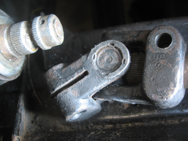 2- Désolidariser la colonne de direction de l'arbre. Pour ce faire, retirer la vis qui solidarise la colonne sur les cannelures de l'arbre. Ensuite, désolidariser le boitier du chassis en retirant les 4 vis qui le fixent sur le brancard avant (caler l'auto sur une chandelle et retirer la roue gauche) et les vis de la ferrure sous le boitier. Ainsi, il est possible d'éloigner le boitier de la colonne pour le déconnecter de celle-ci (repérer la position de la colonne par rapport à l'arbre d'entrée).
