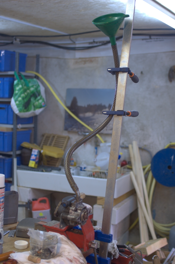 Sur ses conseils, j'ai démonté la pompe et fait un dispositif permettant d'identifier l'endroit de la fuite.
