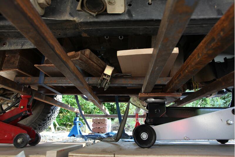 J'avais à ma disposition deux crics bouteille et une sangle à cliquet. l'ensemble élingué par la sangle elle-même passée autour d'un madrier posé à la place des sièges et mon jardin. Une fois suffisament haut, les crics ont fait le reste. Mais par comble du masochisme... je n'avais pas déposé l'échappement car trop compliqué (pièces adaptées et soudées par l'ancien proprio pour virer le cata). Il fallait donc remonter la BT+BV en biais pour la pivoter pour que ça passe.