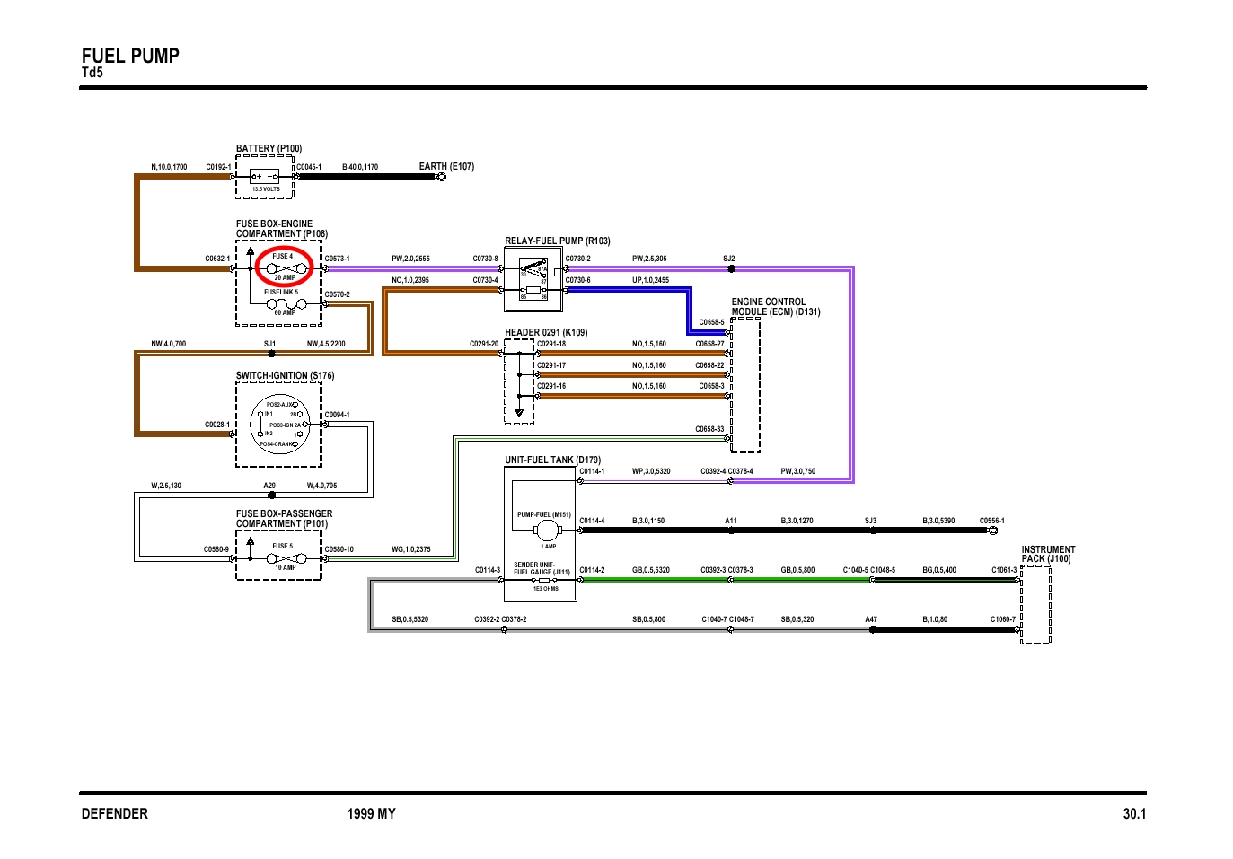 Par laquelle le + 12V arrive, via le petit fusible repère 5 de 30A. Comme on peut le voir sur le schéma 4) c'est un +12V permanent, car directement relier à la batterie. D'ailleurs, au passage, ce boitier de fusible est repéré comme étant dans le compartiment moteur, si quelqu'un a un def avec ce boitier dans le compartiment moteur, je suis preneur de sa première date de mise en circulation. Car oui, sur les Disco c'est dans le compartiment moteur, mais pas sur les def, ou alors, il y a longtemps et pas pendant longtemps.