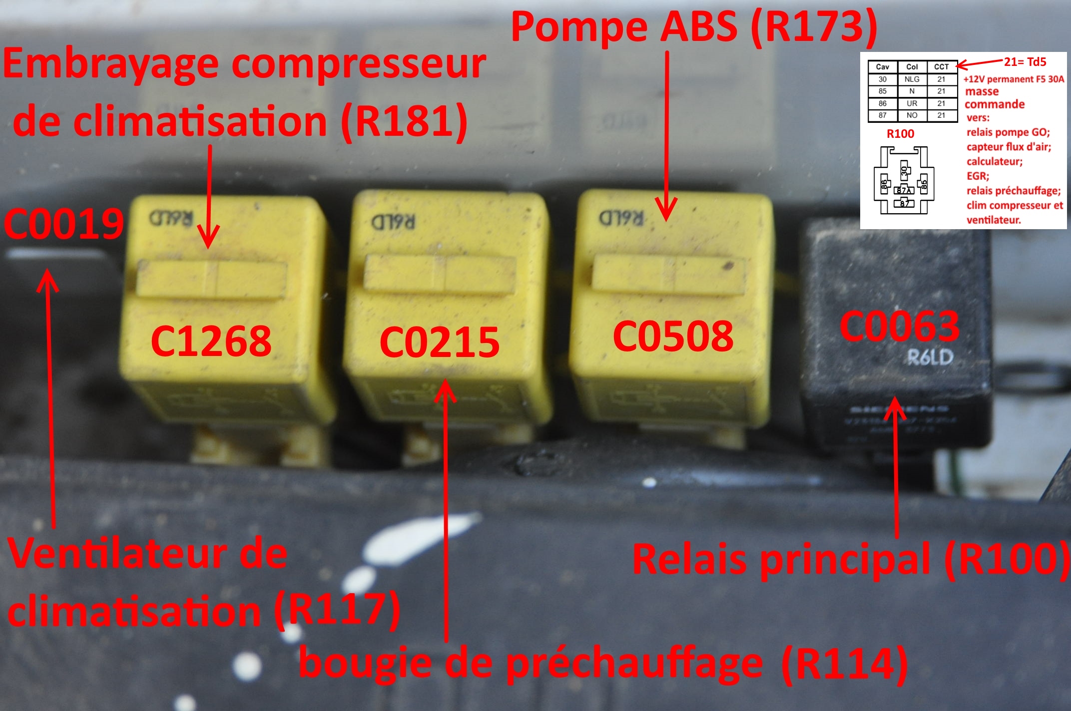 2) Oui, donc apparemment, le fil dénudé broche 9, va au relais principal R100 broche C0063-30