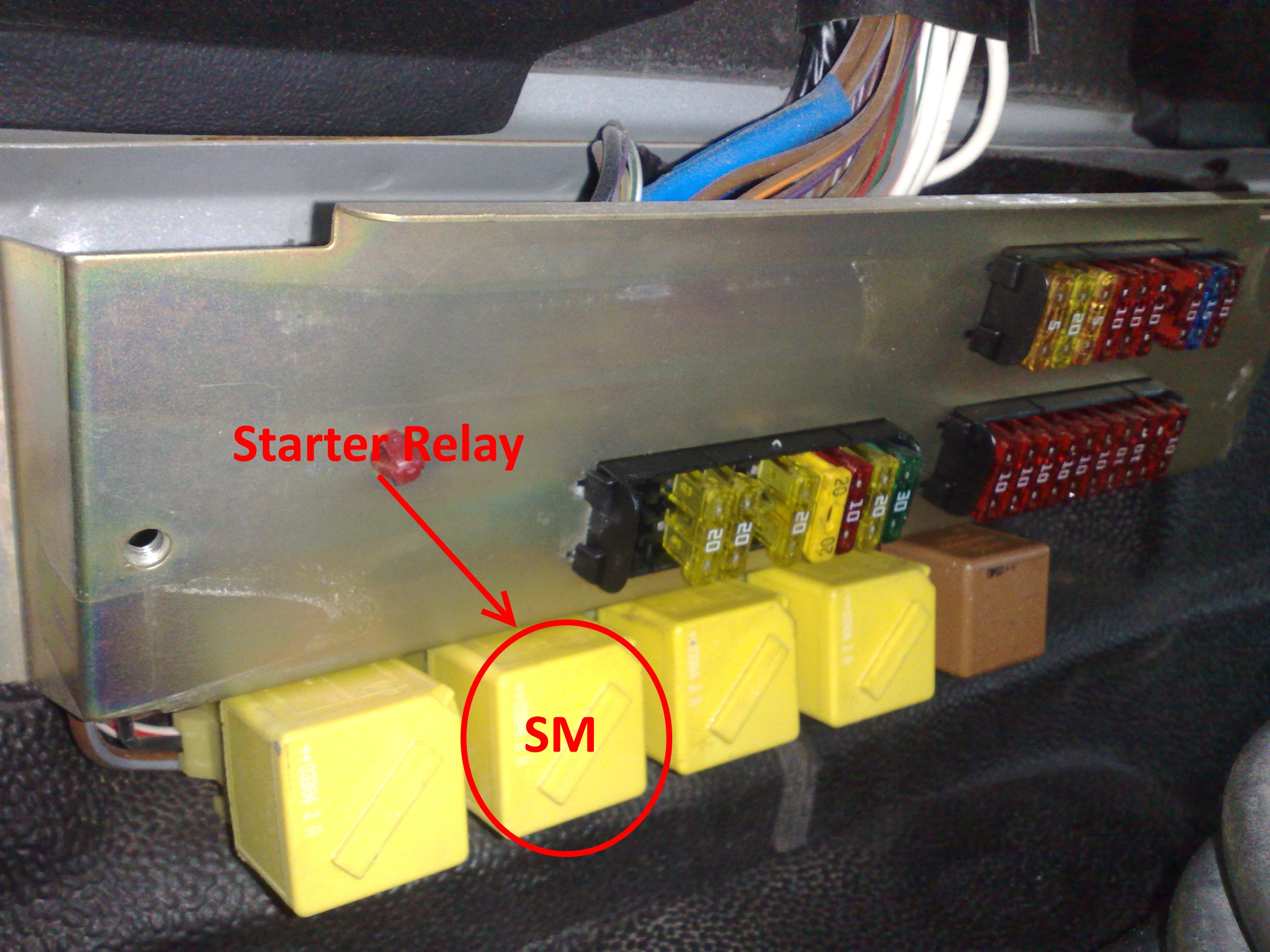 A moins que ton tableau de fusibles soit avec une barrette de fusible satellite supplémentaire, comme si cela ne suffisait pas, dans ce cas le relais SM est en quatrième position en partant de la droite.